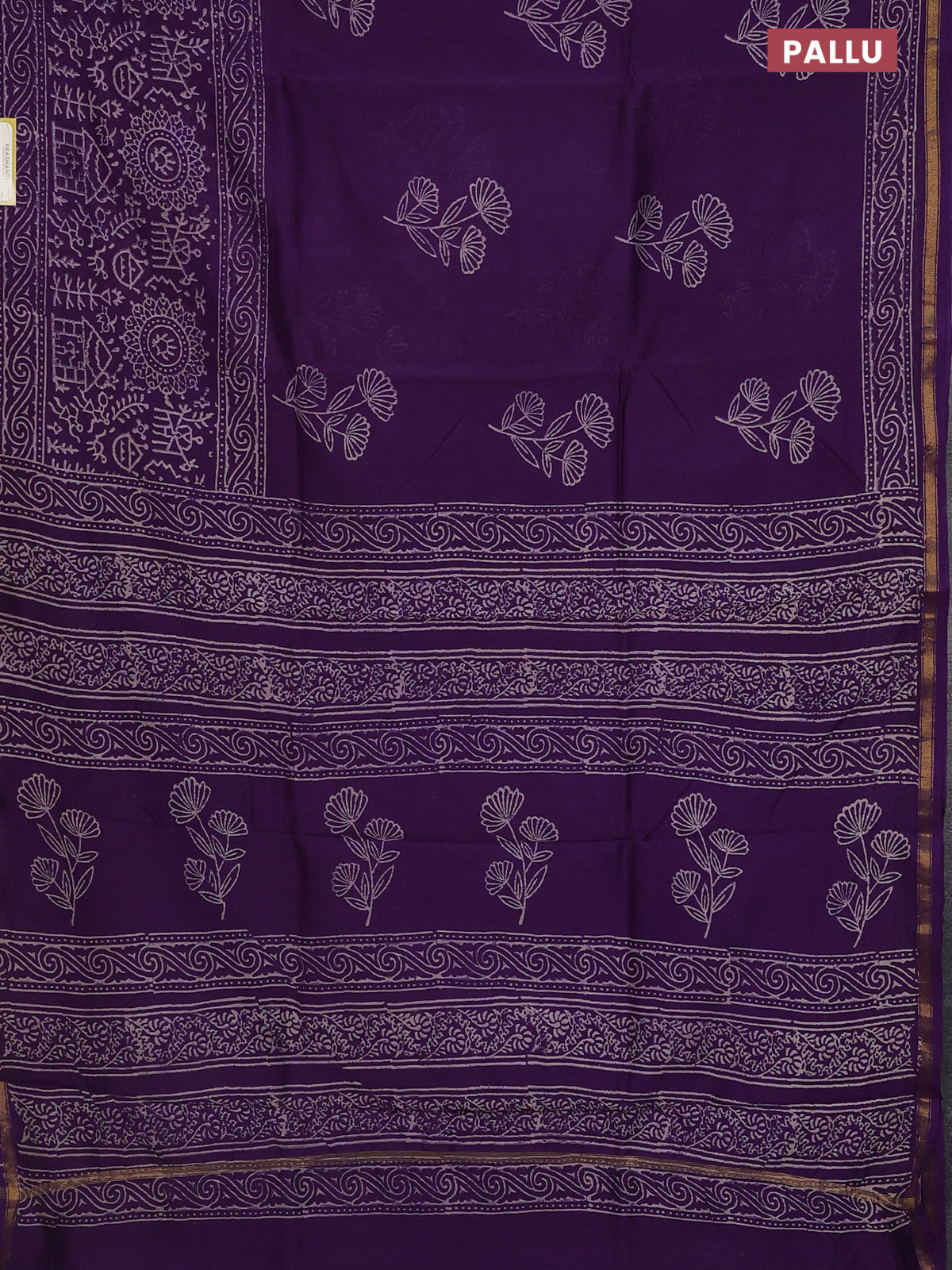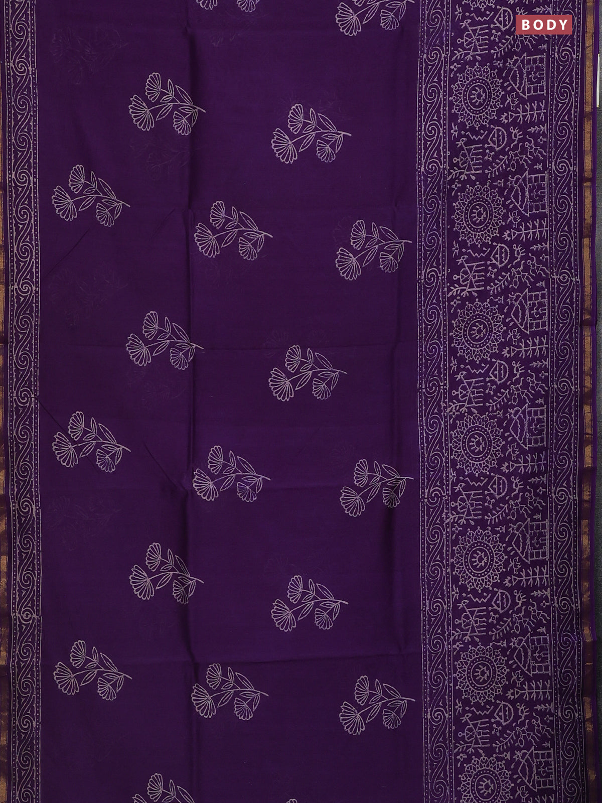 Chanderi bagru saree violet with floral butta prints and long printed zari border