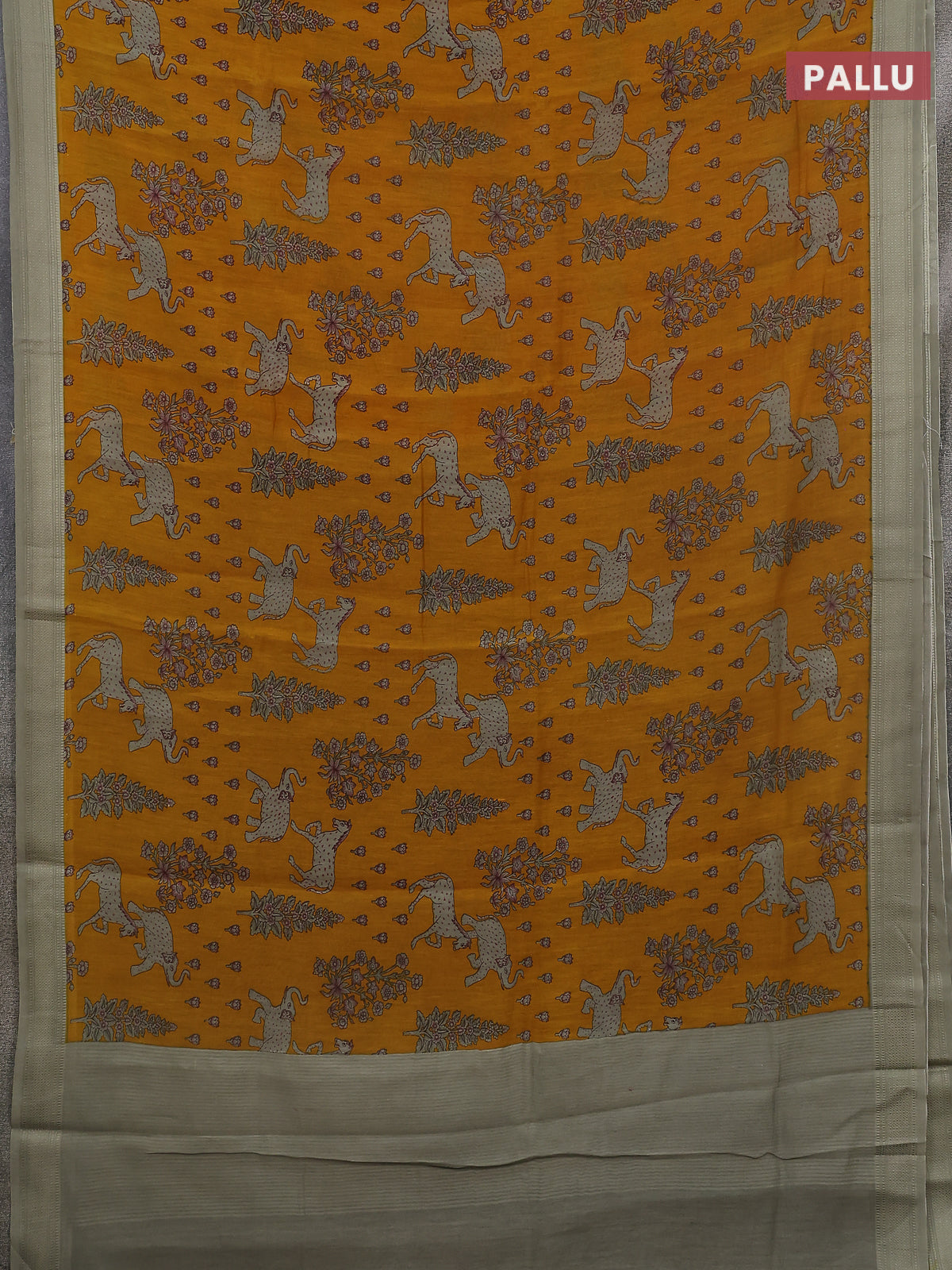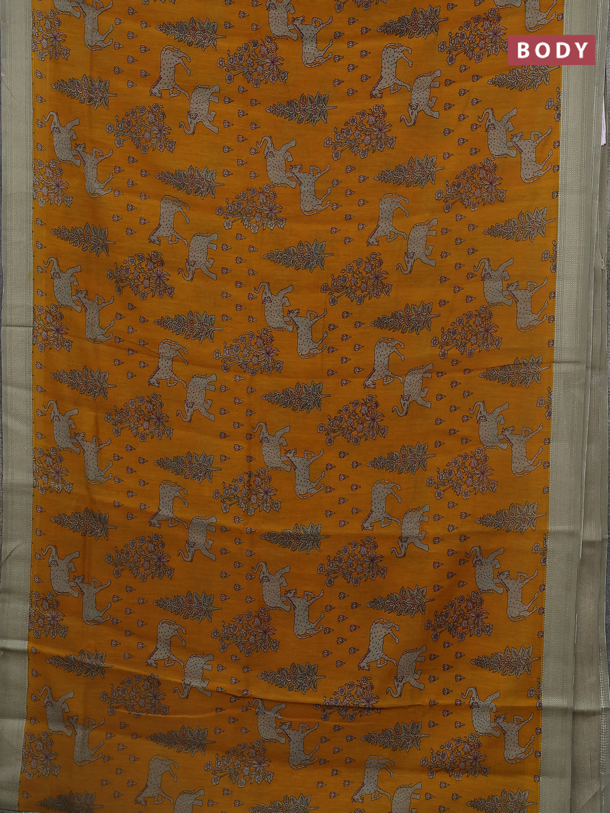 Chanderi silk cotton saree dark mustard and grey shade with allover prints and woven border
