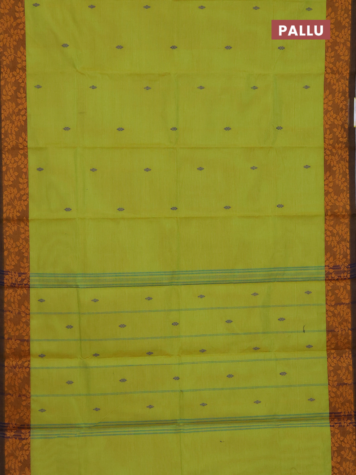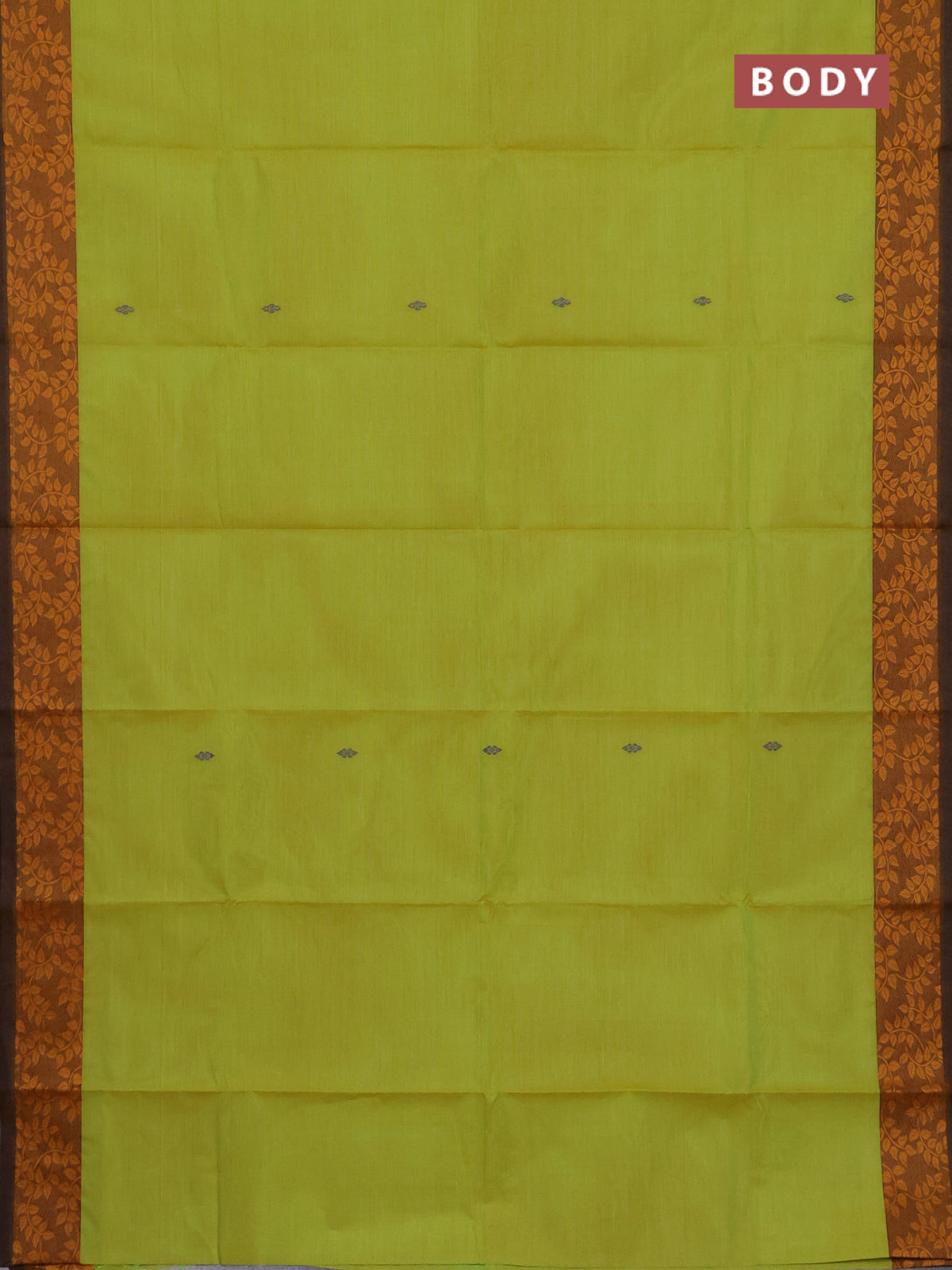 Chettinad cotton saree lime green and brown with plain body and leaf design border