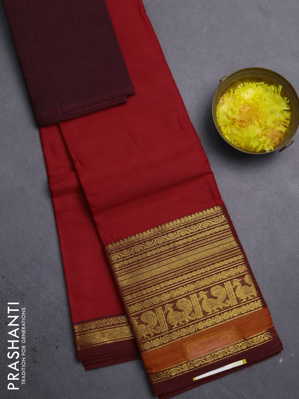 Chettinad cotton saree red and wine shade with plain body and long rettapet zari woven border