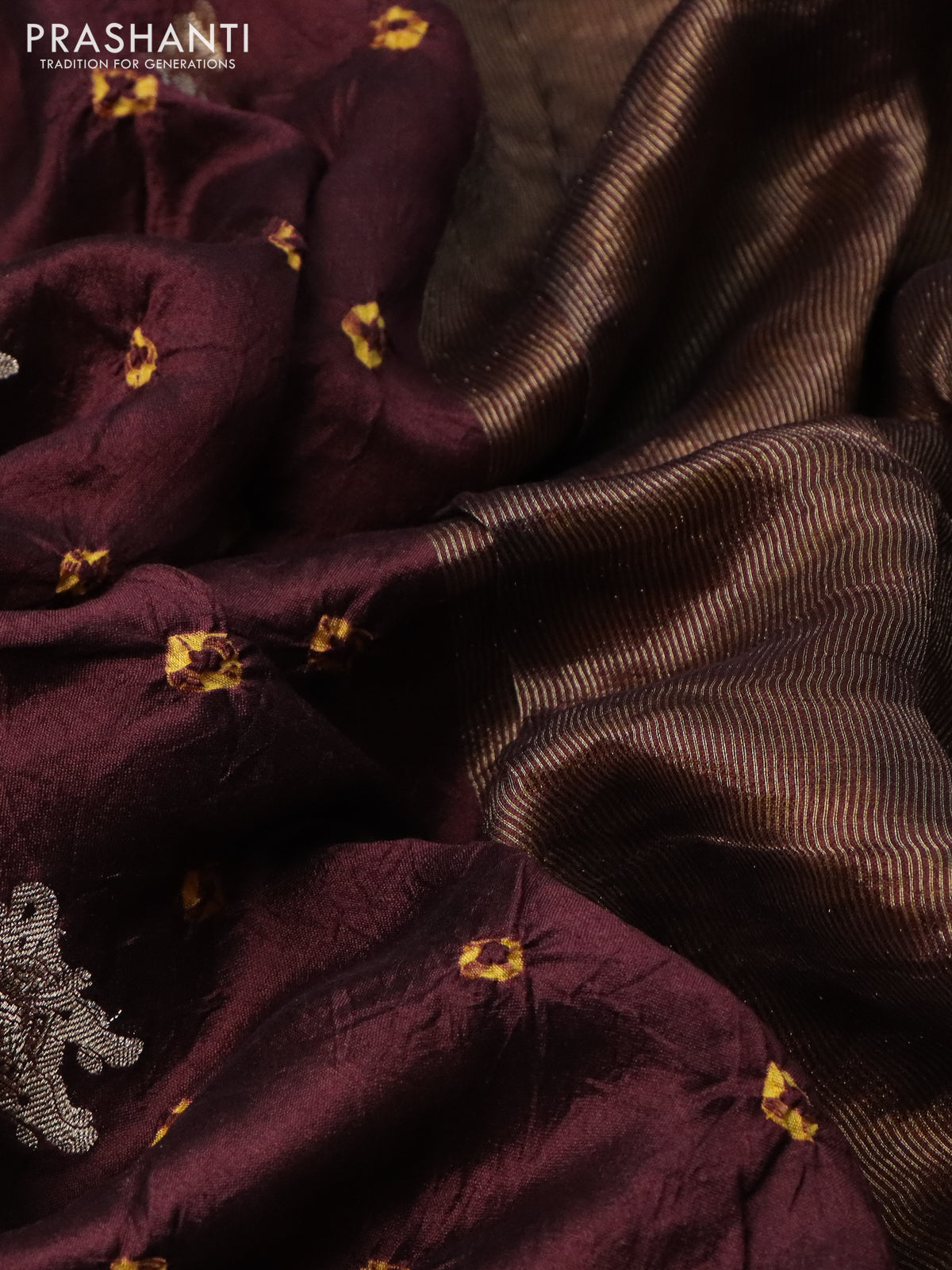 Chiniya silk saree deep maroon and mustard yellow with allover zari buttas & bandhini prints in borderless style