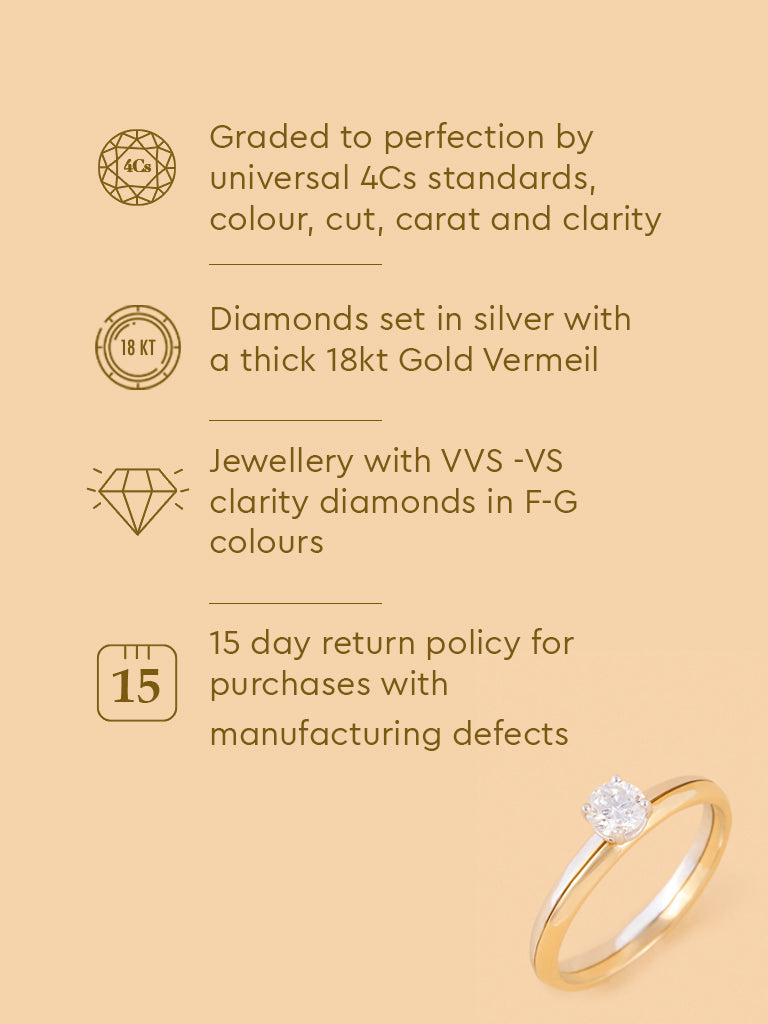 Enjoy timeless appeal with this dual tone solitaire lab diamond ring. Crafted in gold vermeil and sterling silver, it beautifully showcases the diamond’s brilliance.