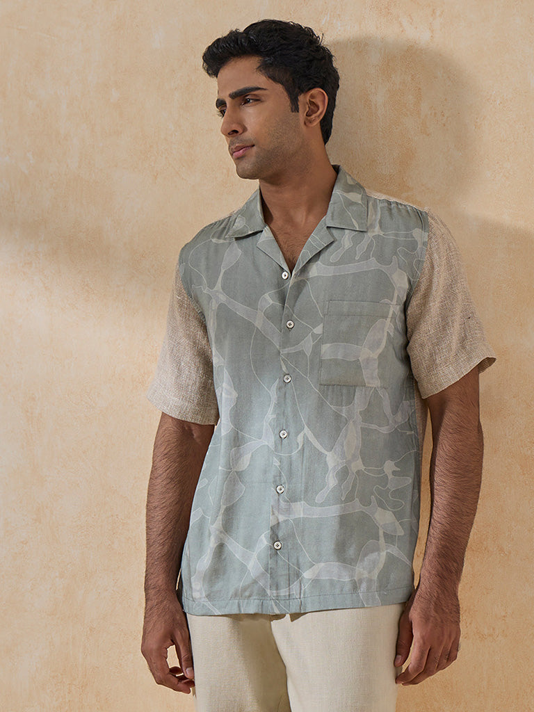 Playful in spirit yet modern in design, this blue shirt reimagines festive dressing with a contemporary twist. A dusty blue body offset by textured sleeves creates a bold color-block effect, while a notched collar and short sleeves keep the silhouette relaxed and easy. Designed for celebrations that spill from day to night, it’s perfect for those who like their festive looks to feel current, confident, and refreshingly effortless.