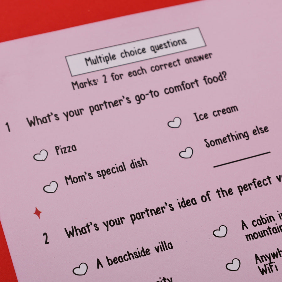 Think you know your partner like the back of your hand? This quiz card is here to put that to the test! Challenge each other in the sweetest way and see who’s been paying attention (and who owes a romantic dinner for forgetting)!