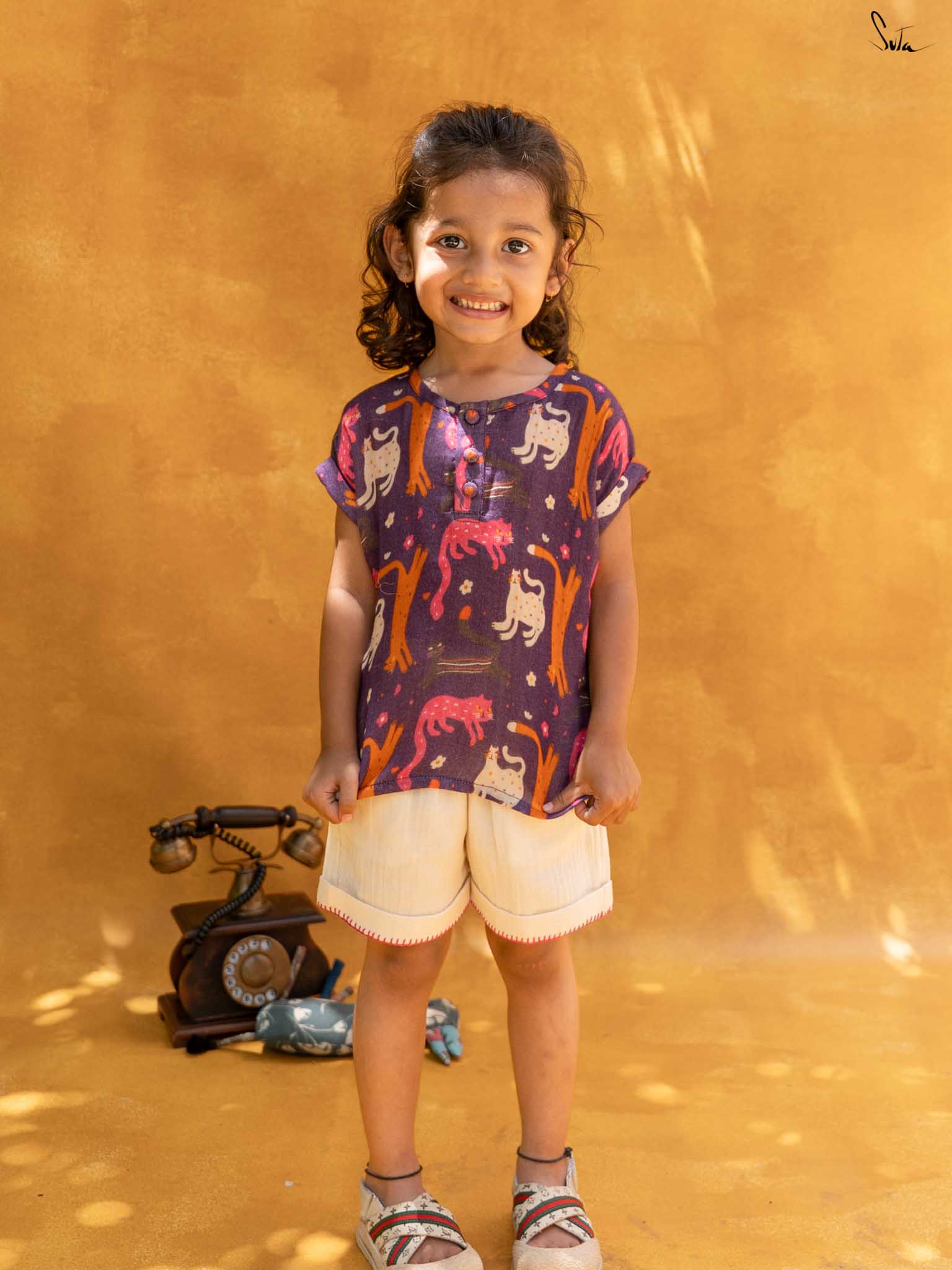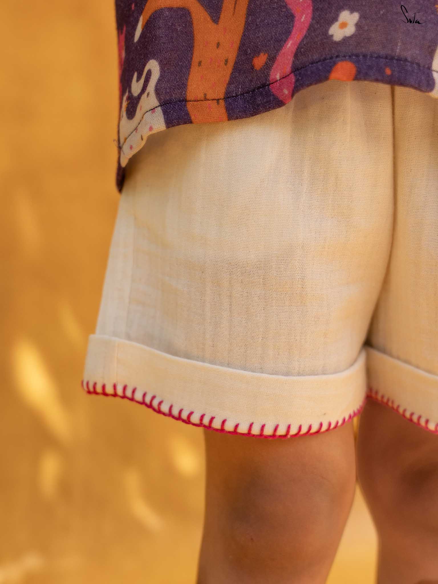 “The cat went fiddle-i-fee…” Zoom like a zigzagging kitty in this fun-packed co-ord! The multi-colored printed shirt is full of personality, with embroidered buttons that dance down the front like a treasure trail. Paired with crisp white contrast pants, featuring delicate buttonhole embroidery at the hems, this outfit is perfect for doodle days, bedtime dances, and every silly moment in between.