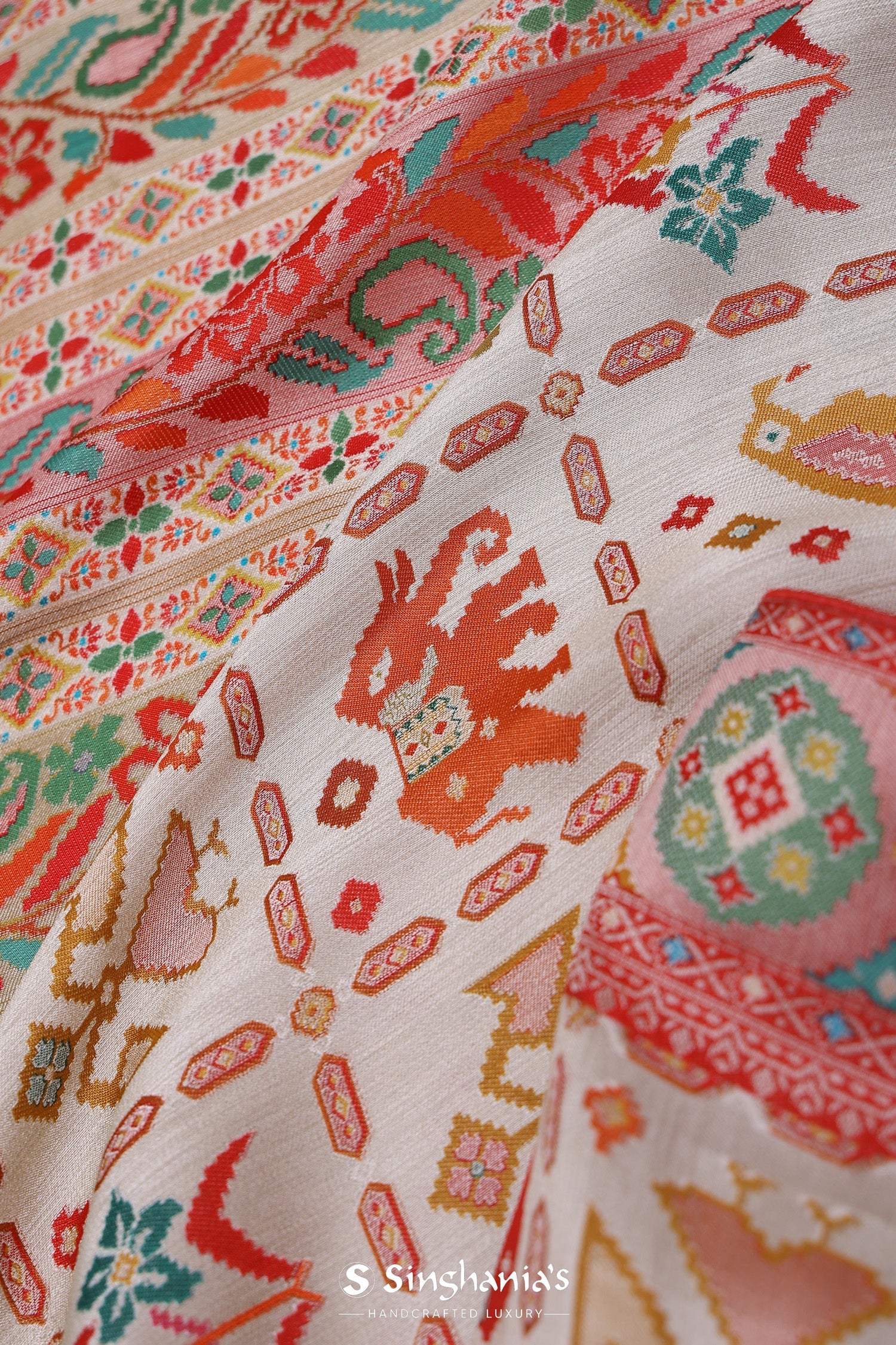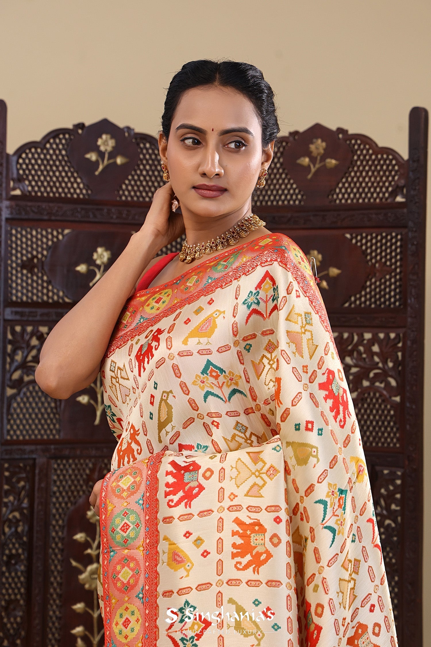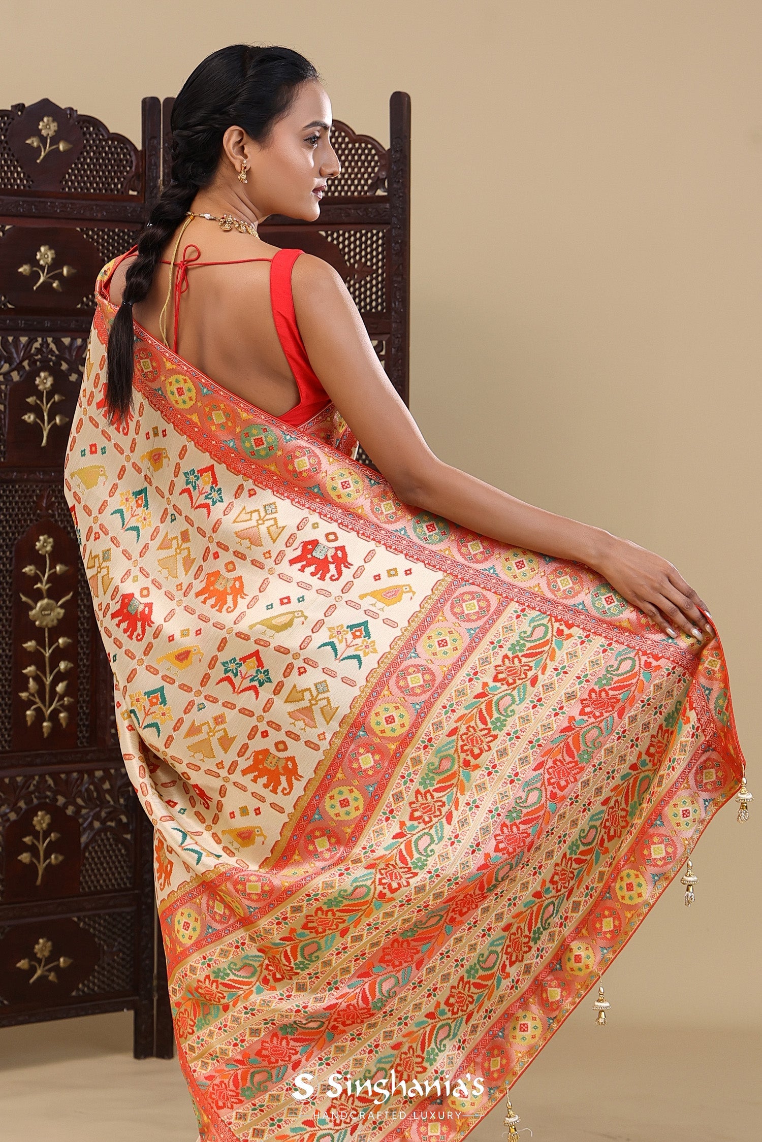 Cream Banarasi Tissue Saree With Animal Motifs