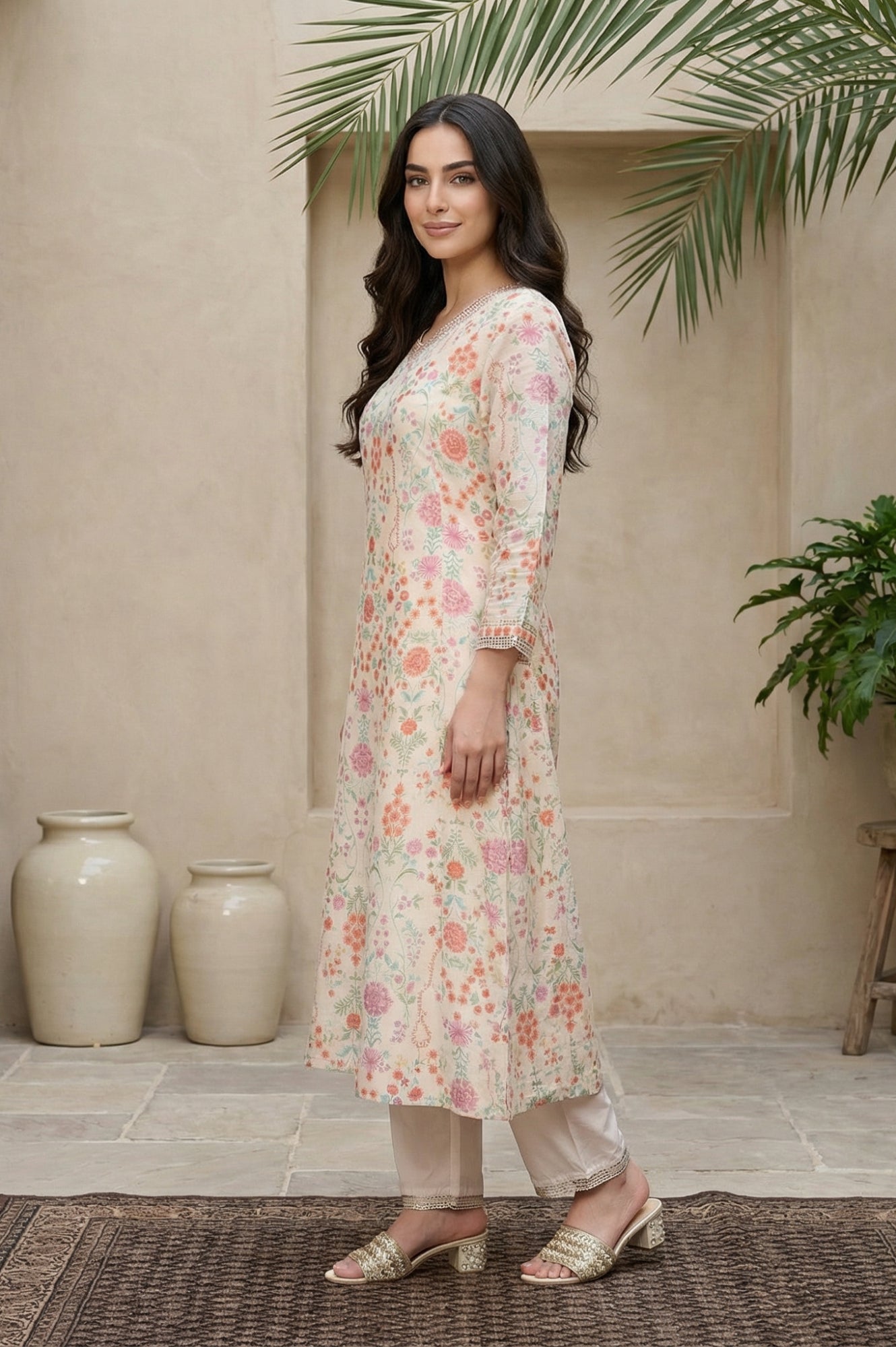 Cream Floral Printed Tissue A-Line Kurta with Straight Pant and Dupatta Set