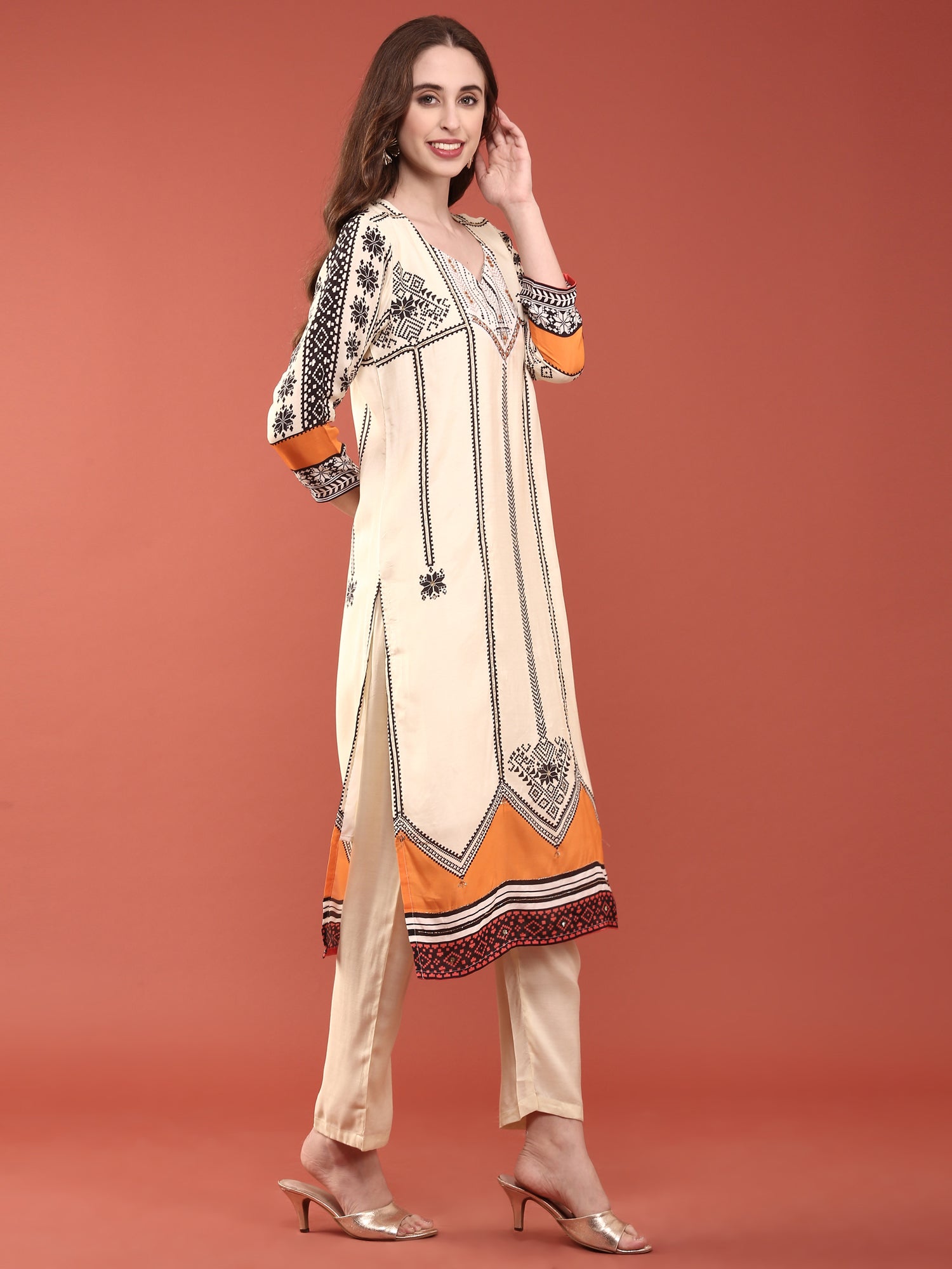 Elevate your wardrobe with this sophisticated three-piece ensemble crafted from premium cream muslin. The digital print detailing adds contemporary flair to the timeless appeal of muslin fabric, known for its breathability and comfort. This versatile set seamlessly transitions from casual daywear to semi-formal occasions, making it an essential addition to your collection.