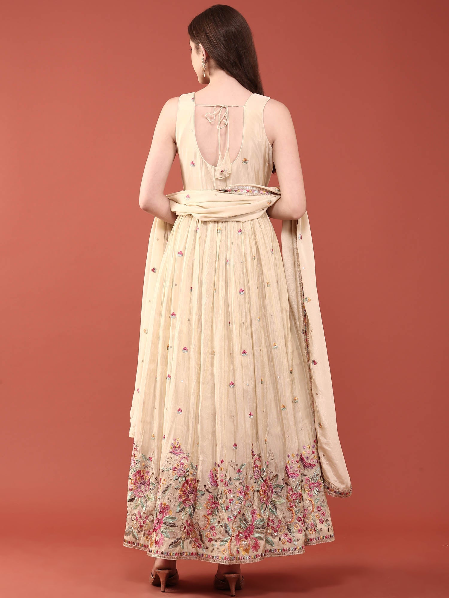 Elevate your ethnic wardrobe with this stunning cream tissue Anarkali set, beautifully adorned with delicate floral embroidery. The lightweight fabric drapes gracefully, offering comfort for both festive occasions and celebrations. The intricate embroidered details add a touch of sophistication and timeless elegance to your look. Perfect for weddings, parties, or cultural events, this set combines traditional craftsmanship with contemporary style. The cream tone complements all skin tones, making it a versatile choice for any complexion. Embrace the charm of classic Indian fashion with this exquisite piece that celebrates artistry and grace.