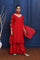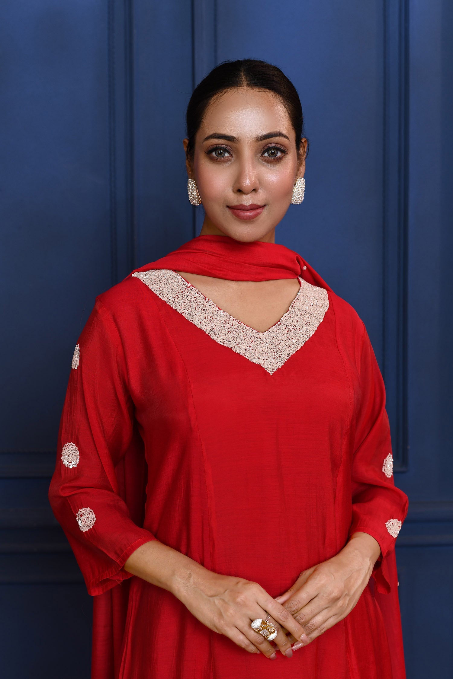 The crimson red solid dupion silk kurta set with subtle embroidered short kurta along with matching sharara and dupatta for a dignified look with simple charm.