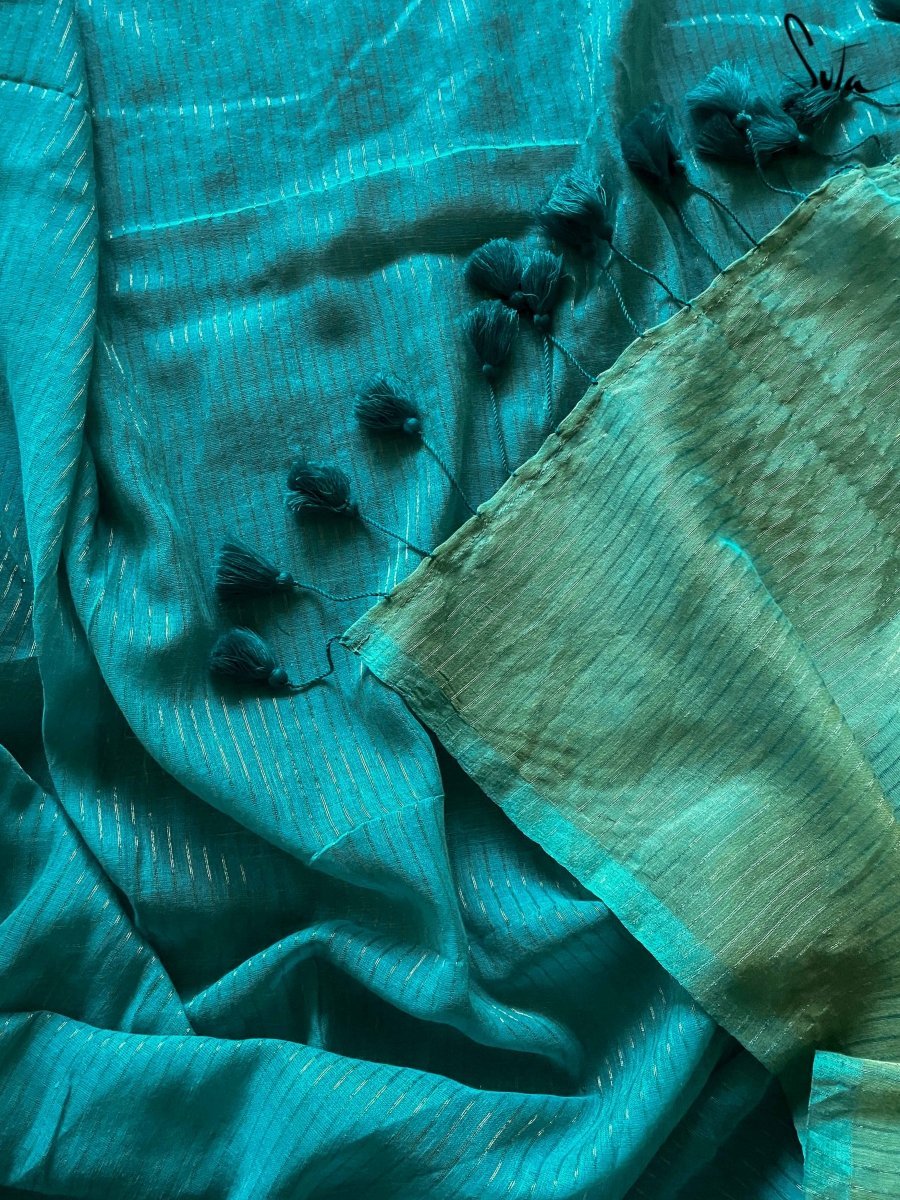 Embrace yourself as you are, for who you are, in this striking blue and green cotton saree with zari detailing.
