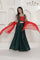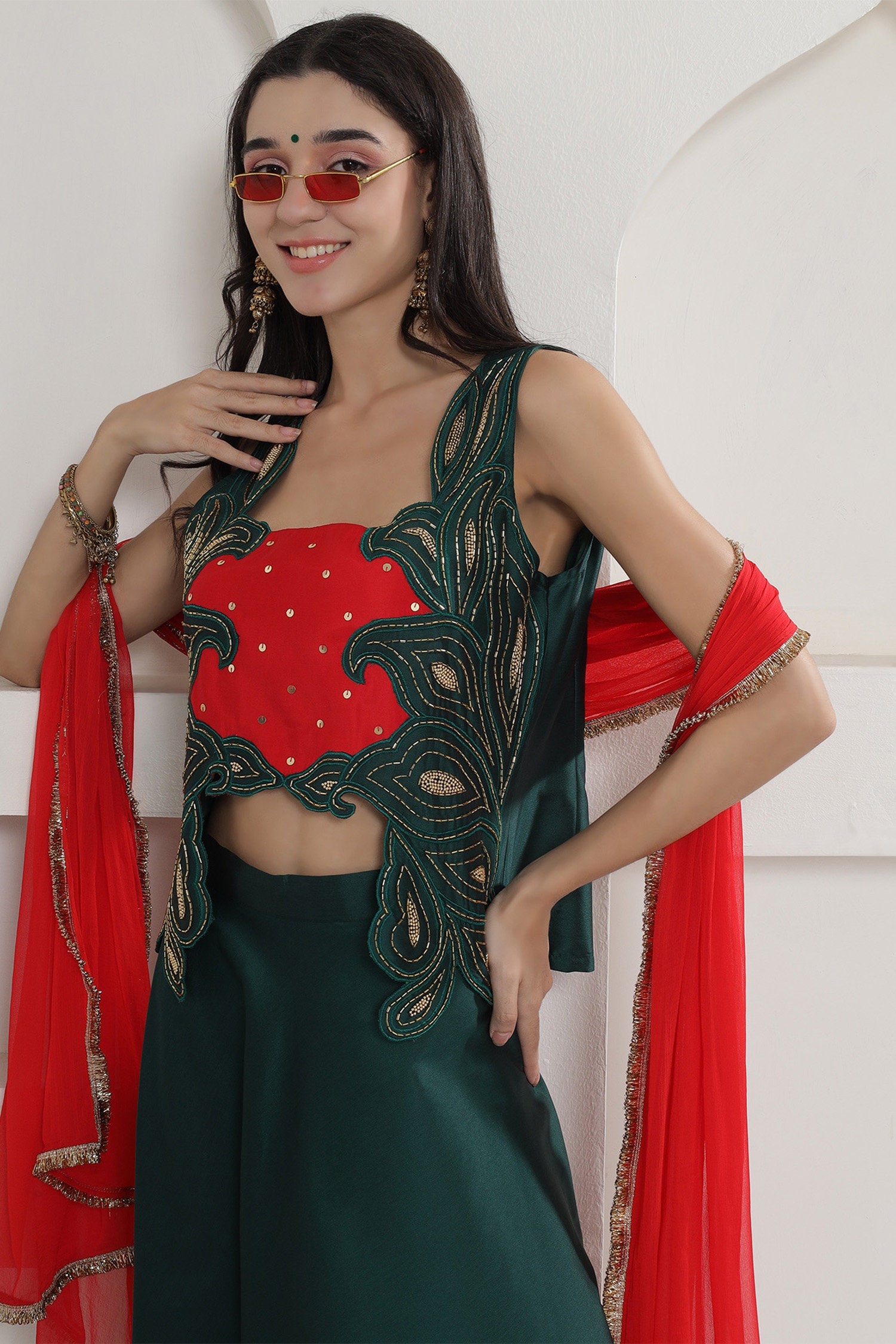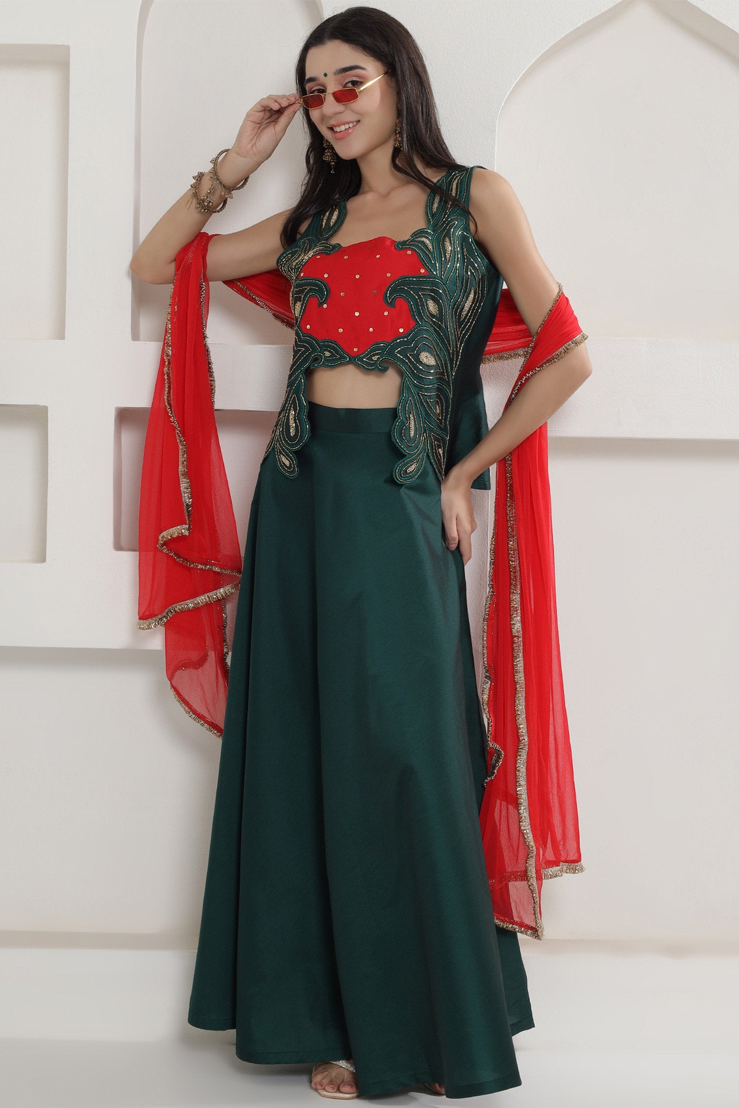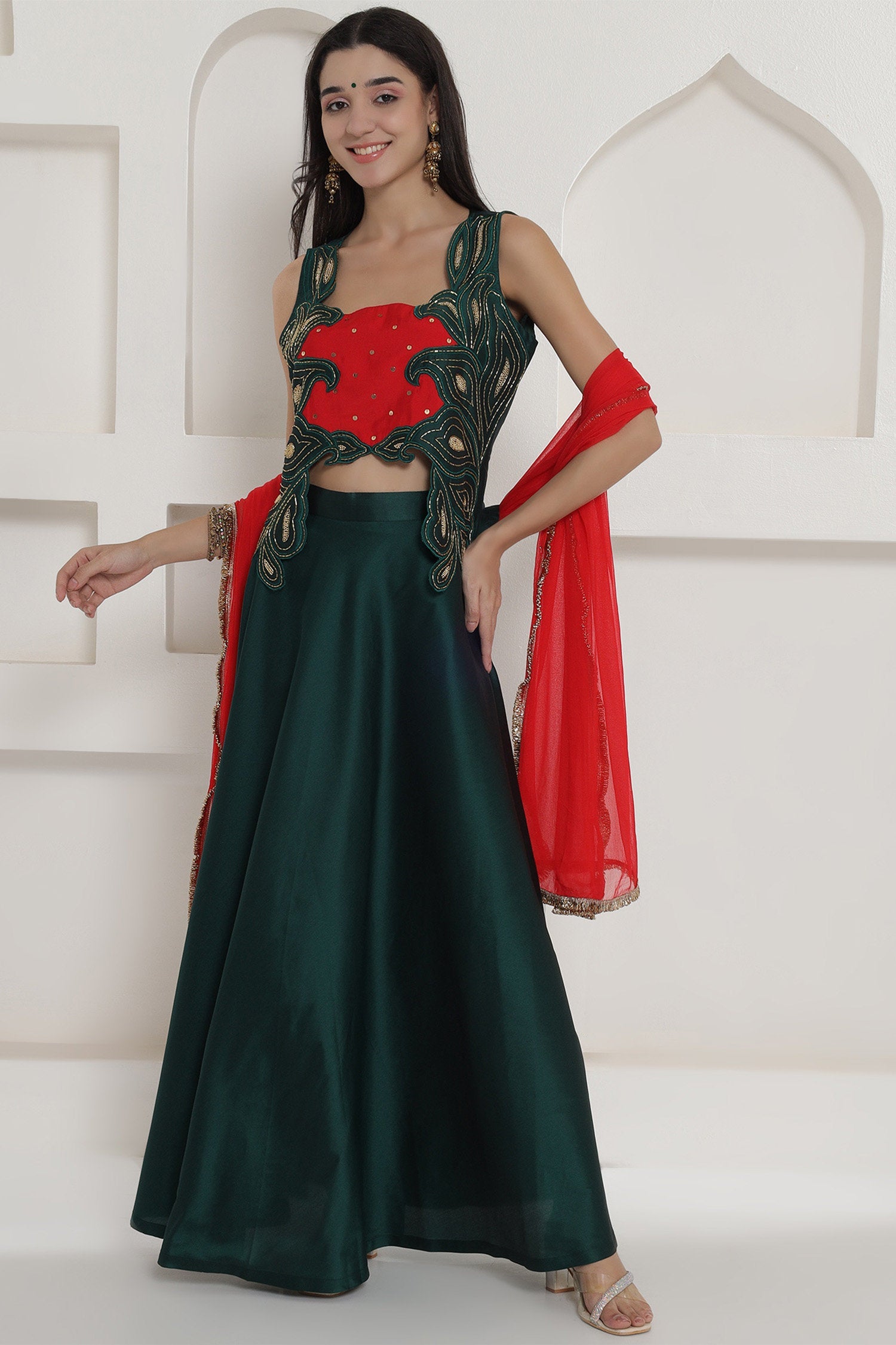 This dark Green silk Lehenga Top and Dupatta Set is beautifully adorn with the kardana on the remaining part of top and sequins handwork on red fabric with dark green plain lehenga .Top has square neckline and paired with red dupatta which makes it perfect for special events and for holidays