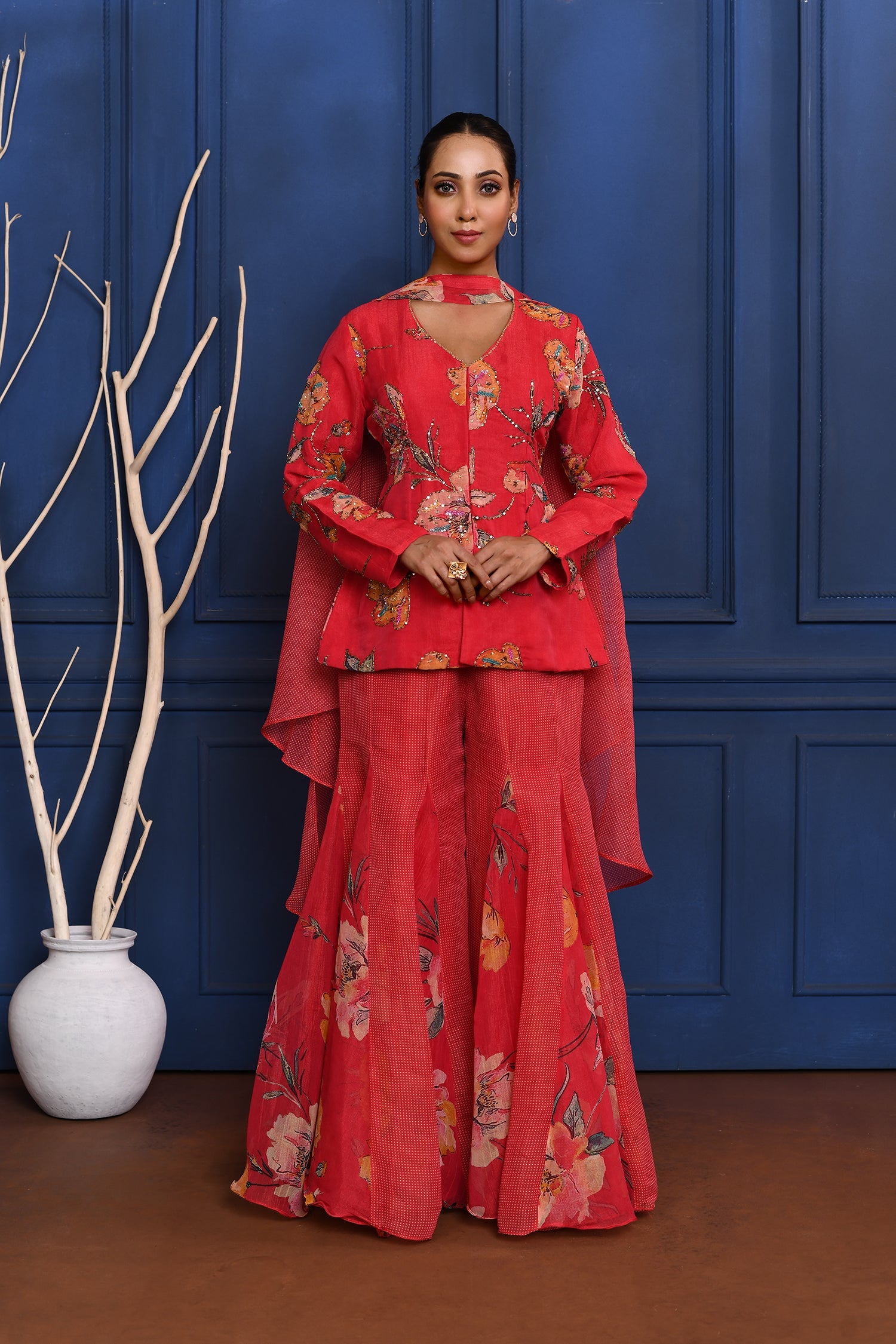 Deep Magenta Pink Floral Tissue Peplum Set