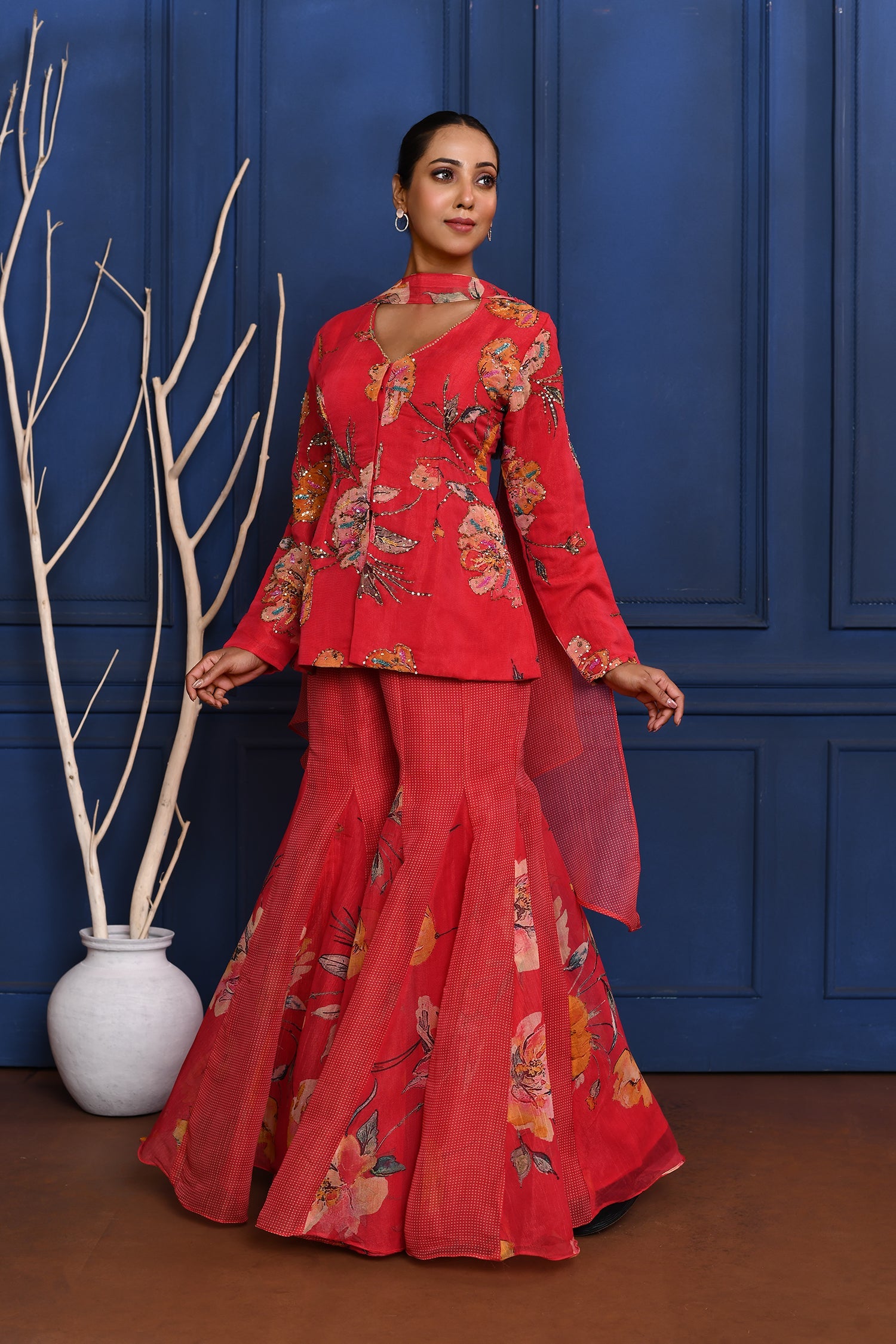 The deep magenta pink floral tissue peplum set with cutdana and sequin embroidery along with georgette dupatta and bottom for a stylish ethnic look .