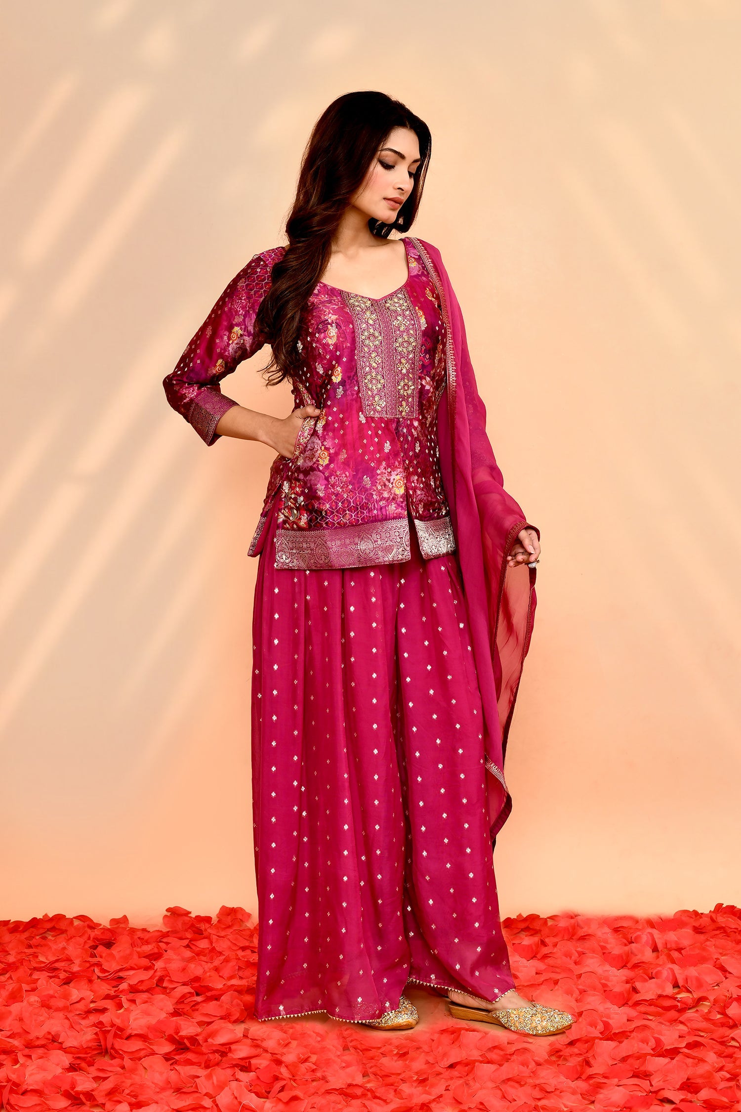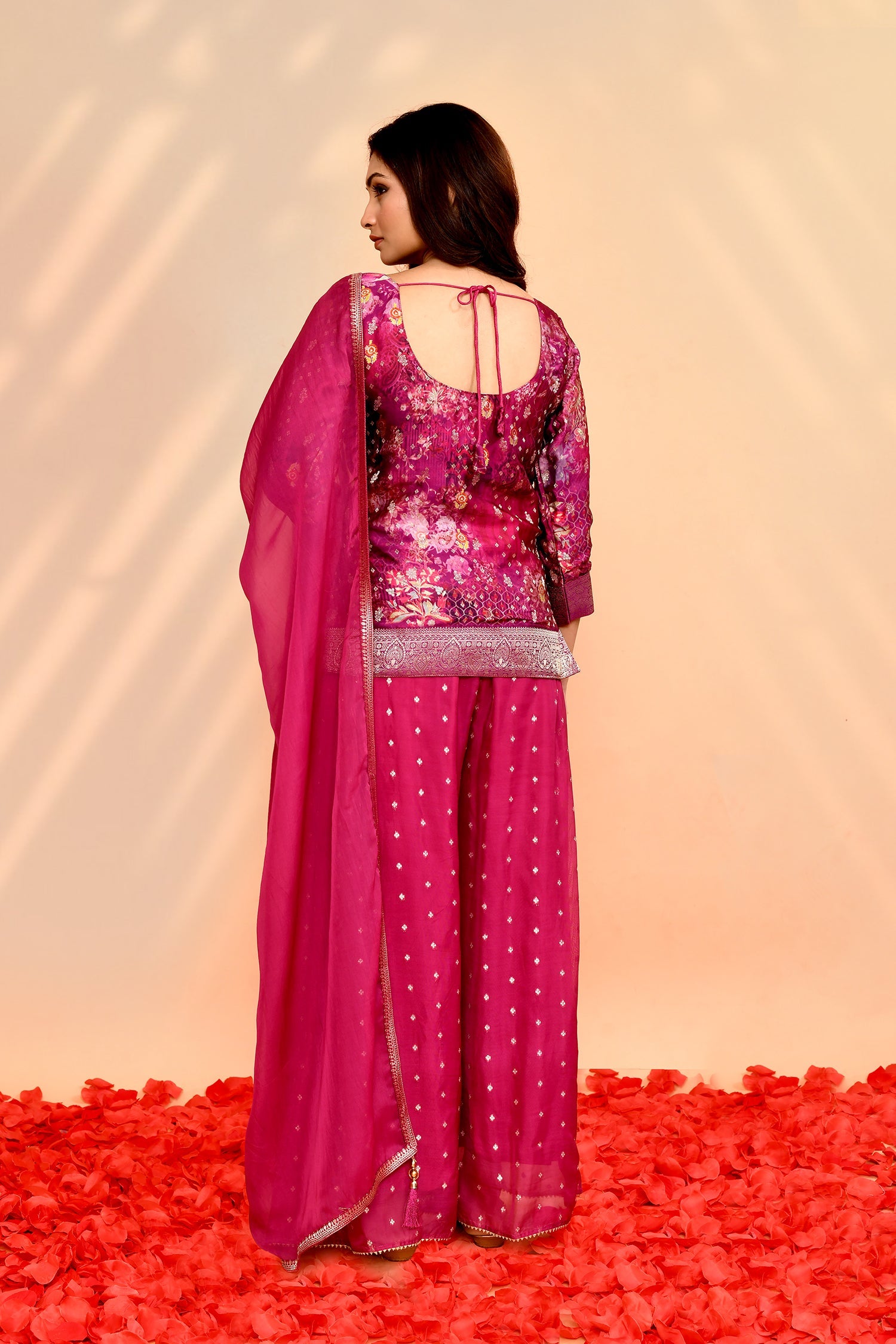The deep pink georgette floral sharara set with dupatta and floral printed V-neck top for a neat traditional look with graceful appearance.