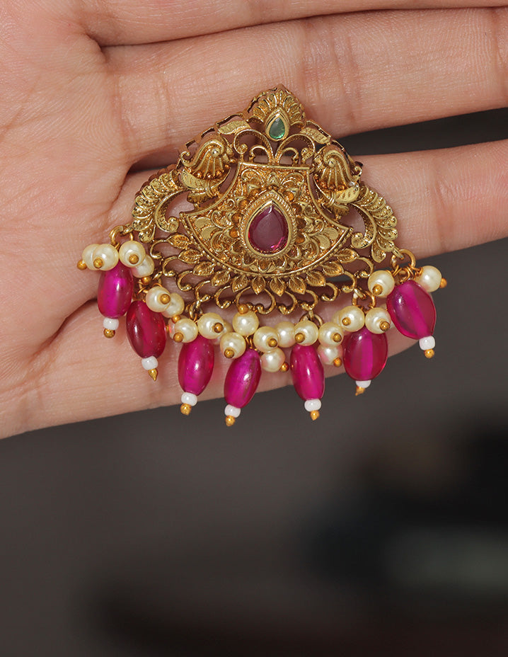 A majestic temple-style Choti Piece featuring an ornate gold finish, centered ruby stone, intricate motifs, and rich danglings of pearls and ruby beads—perfect for traditional grandeur.