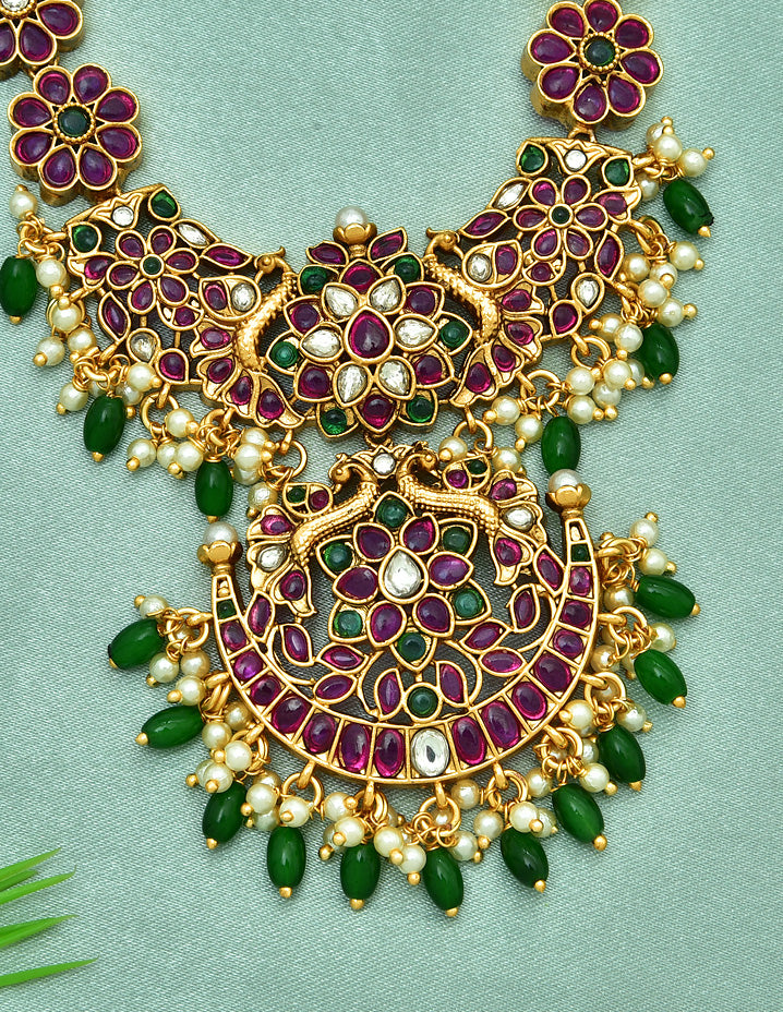 This beautiful Matt Gold Plated Floral Design Long Haaram Set is made of the highest quality metalwork and embroidered with dazzling Ruby and Emerald Stones Paired with matching earrings set in traditional ethnic artwork, it's perfect for any traditional occasion and makes a bold style statement with its eye-catching desi looks.