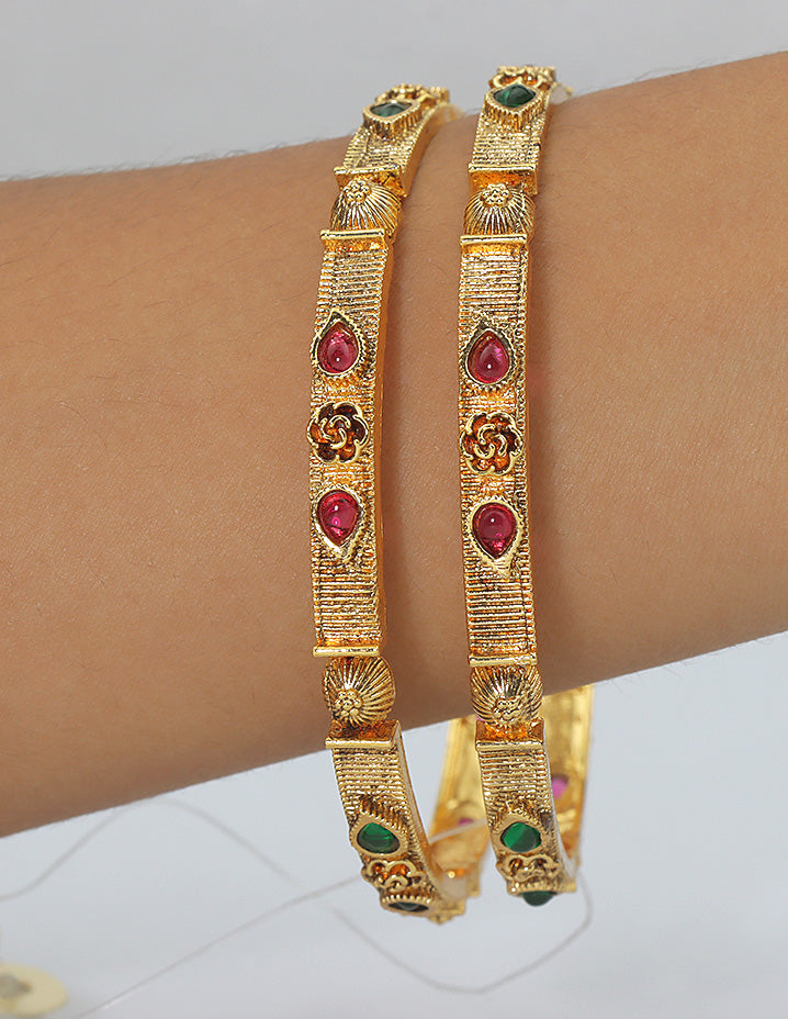 A stunning pair of gold-finish bangles adorned with intricate floral carvings and vibrant red and green stone accents—perfect for festive elegance or timeless tradition.