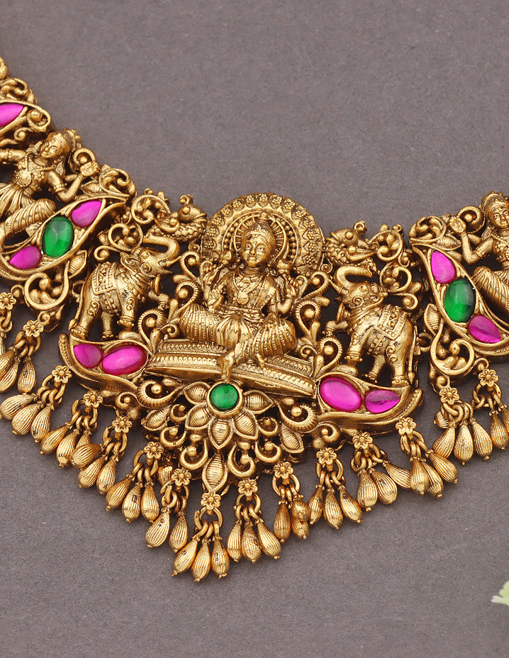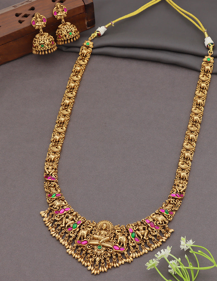This Matt Kempu Lakshmi Devi Long Haram Set, adorned with Rani Pink & Emerald stones and gold beads, adds a touch of traditional elegance.With matching earrings, it’s the perfect statement piece for any occasion, making a bold, eye-catching impact.