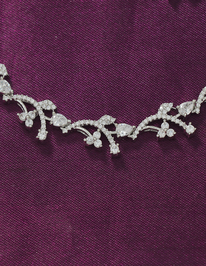 This Designer Zirconia Elegance Necklace Set features sparkling white stones enhanced by a durable rhodium polish. Its refined craftsmanship adds a sophisticated glow to any ensemble.