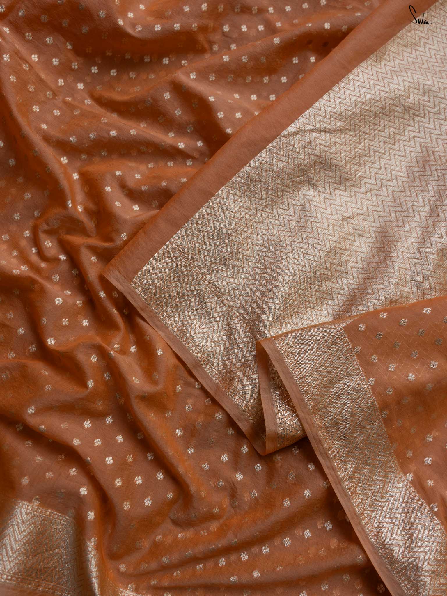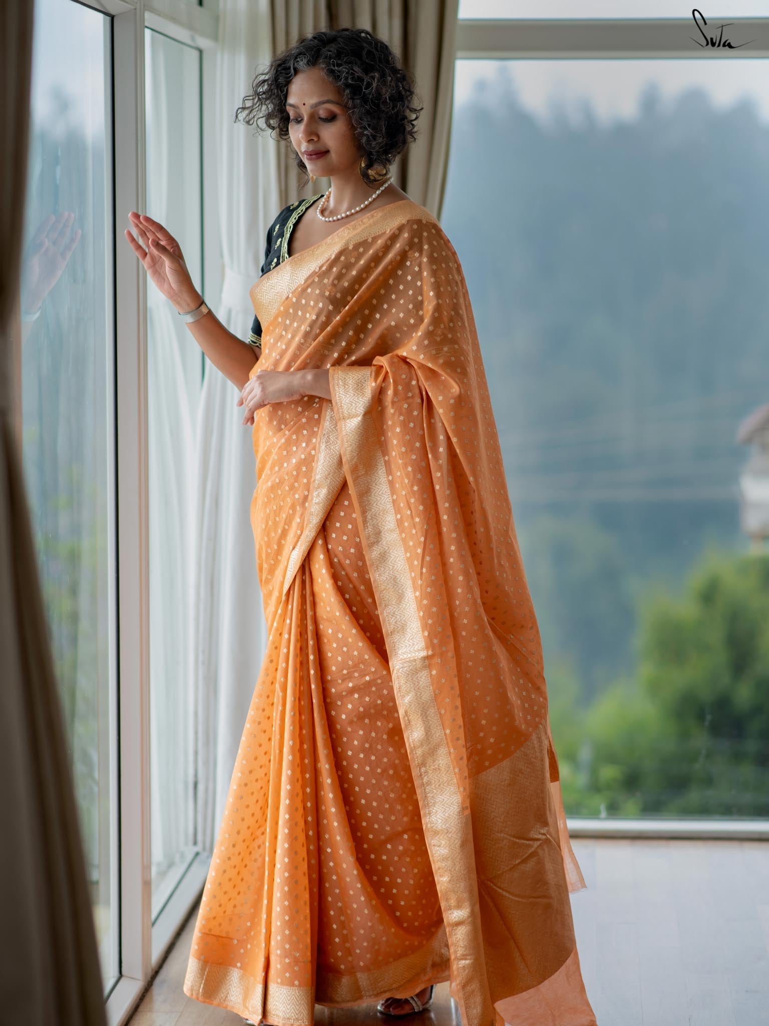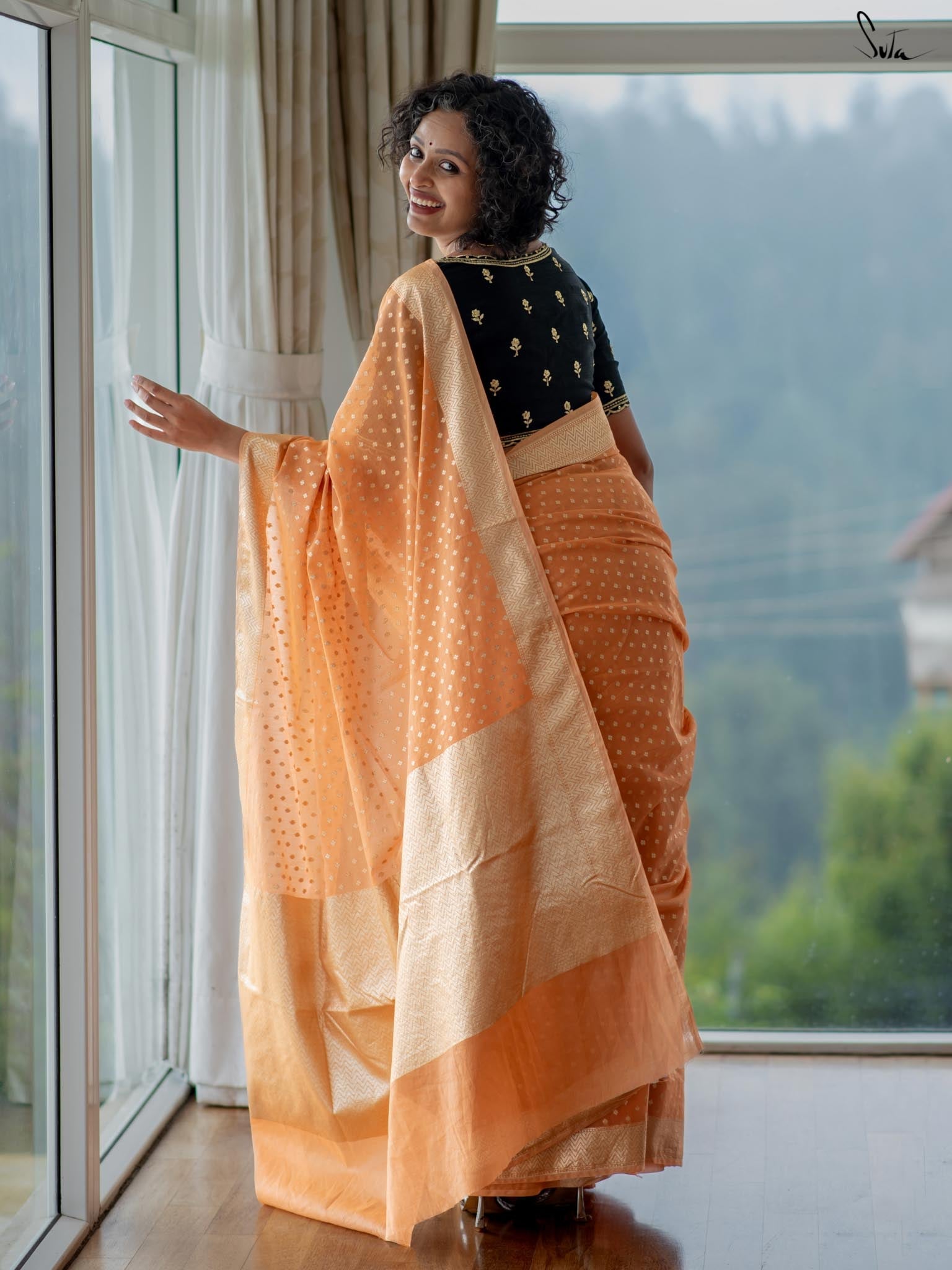 Paying ode to the soothing glow of the winter sun, the 'Dhoop Ka Taj' saree is well and truly a heartwarming piece of art. Woven from lustrous cotton polyester fabric, this jacquard saree features a shining peach base that resembles the shining wedding lights, every sparkle of which screams celebratory vibes!