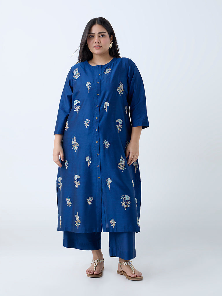 Revamp your festive edit with this blue kurta from Diza. Showcasing floral embroidery for a chic touch, this A-line silhouette is styled with a band collar, a buttoned placket and three-quarter sleeves.