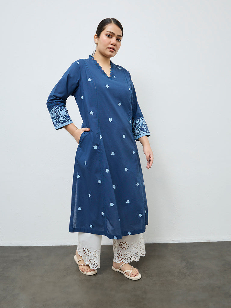 Diza Indigo Floral Embroidered Cotton A-Line Kurta