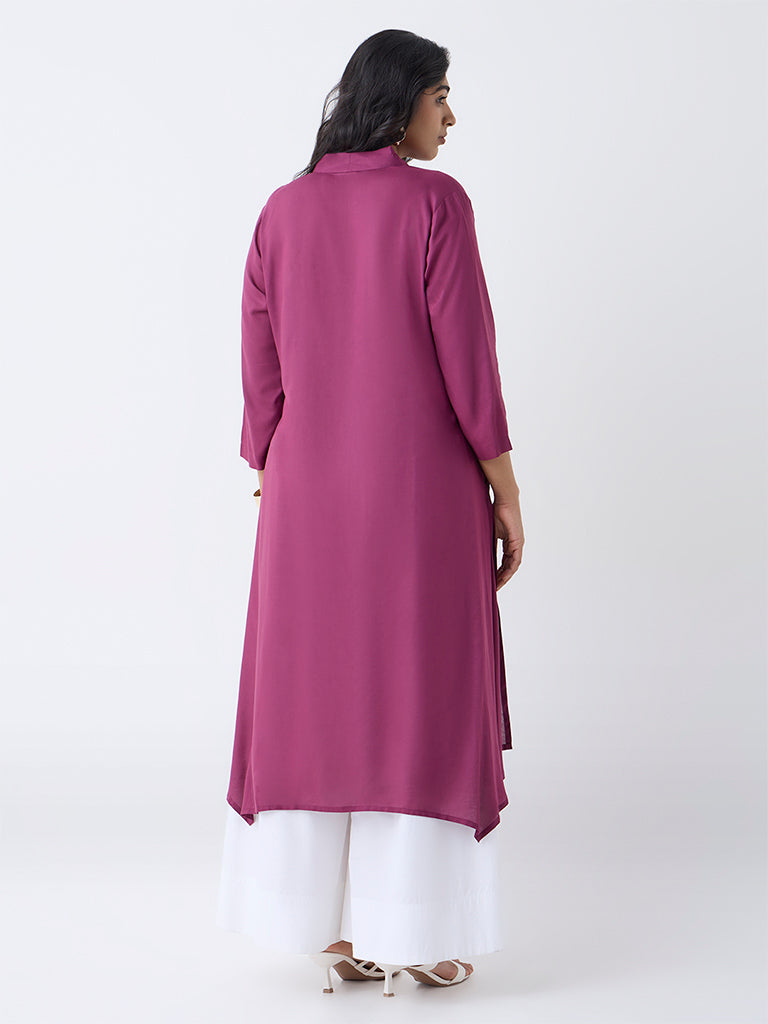 Breathe new life into festive dressing with this plum kurta from Diza. Embroidered with delicate floral motifs, it’s tailored from a lightweight fabric that moves with ease. The V-neckline, side pockets and three-quarter sleeves add practical charm to its graceful aesthetic.