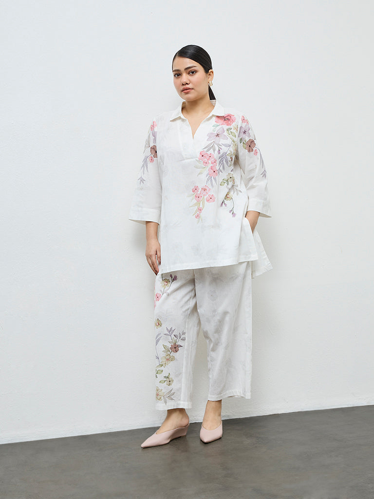 Diza White Floral Pattern High-Low Cotton-Blend Tunic