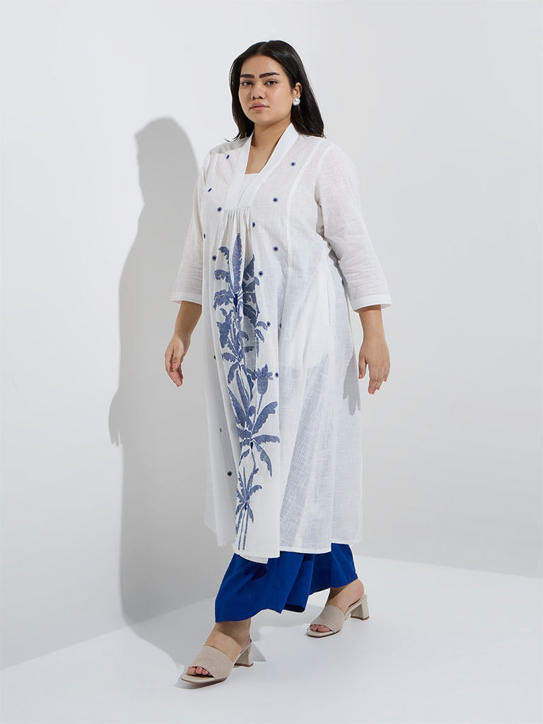 Diza White Tropical-Inspired Cotton A-Line Kurta
