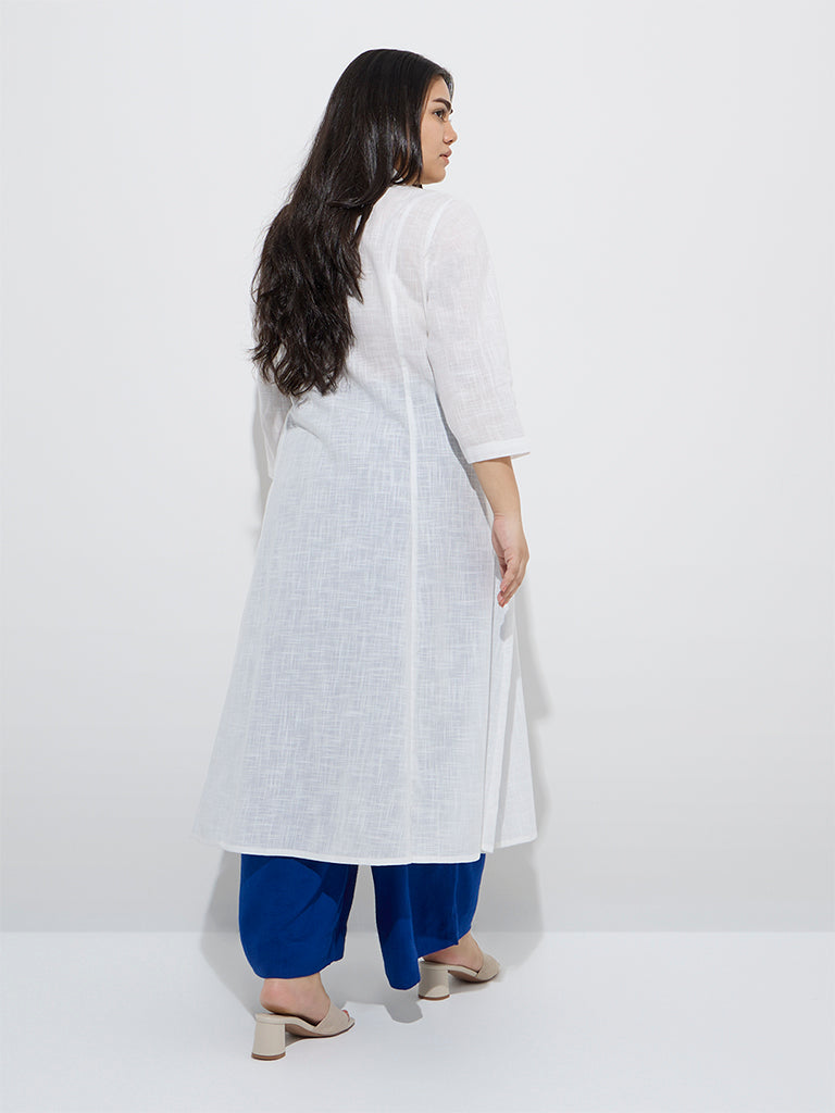Add a touch of grace to your ethnic wardrobe with this white kurta from Diza. Milled from pure cotton, it features tropical-inspired embroidery in a flattering A-line silhouette. Designed with a V-neck and three-quarter sleeves, it also includes slip pockets for practical convenience.