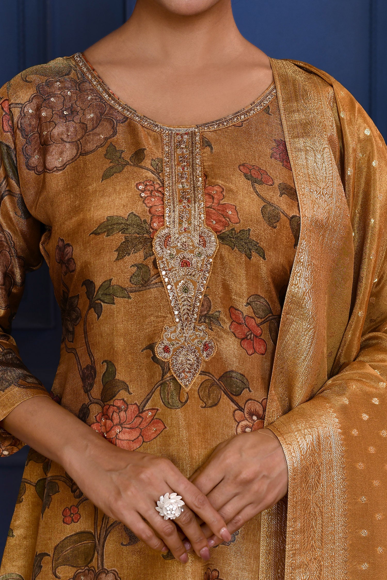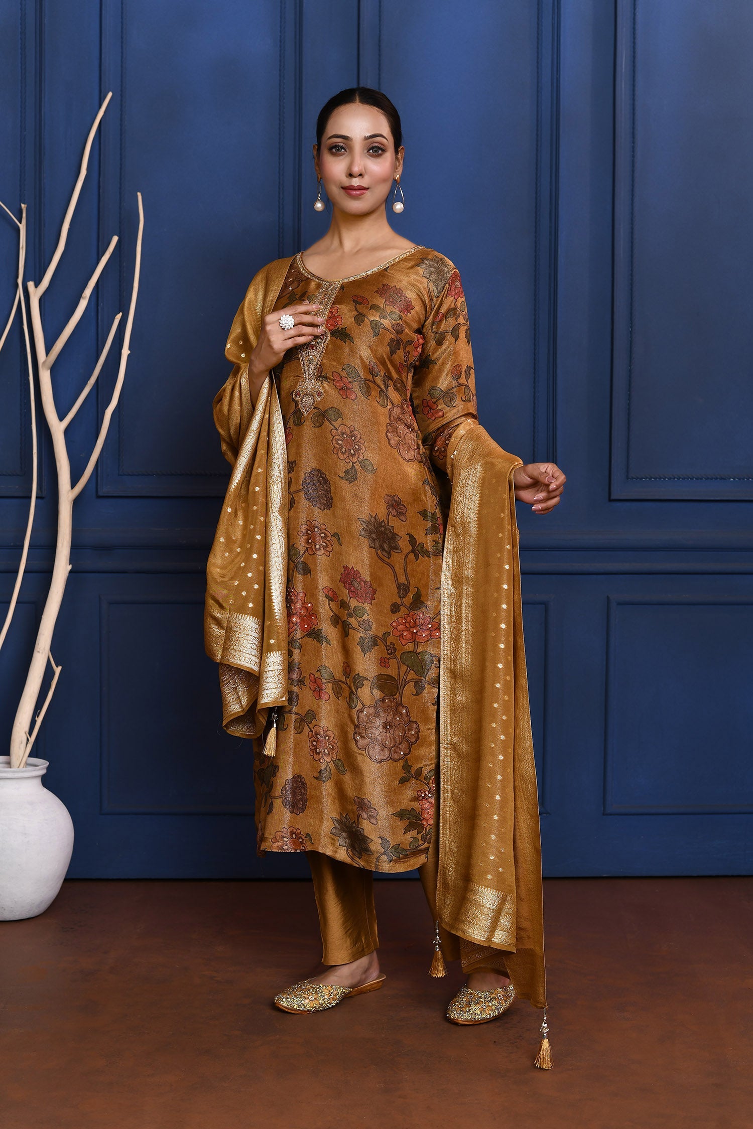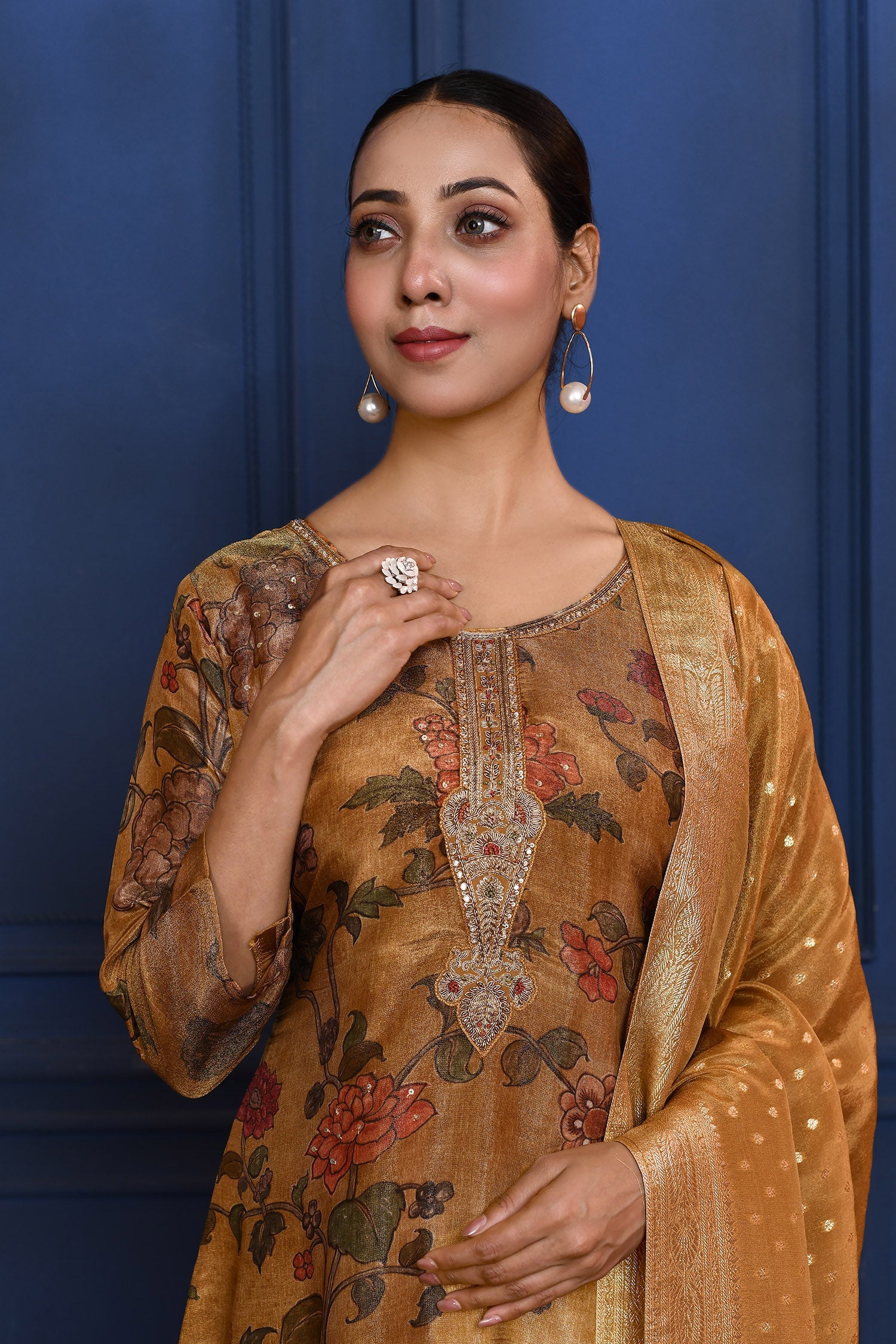 The earthy brown floral printed tissue kurti with matching zari woven dupatta and pant for a decent traditional look with graceful appearance.