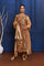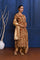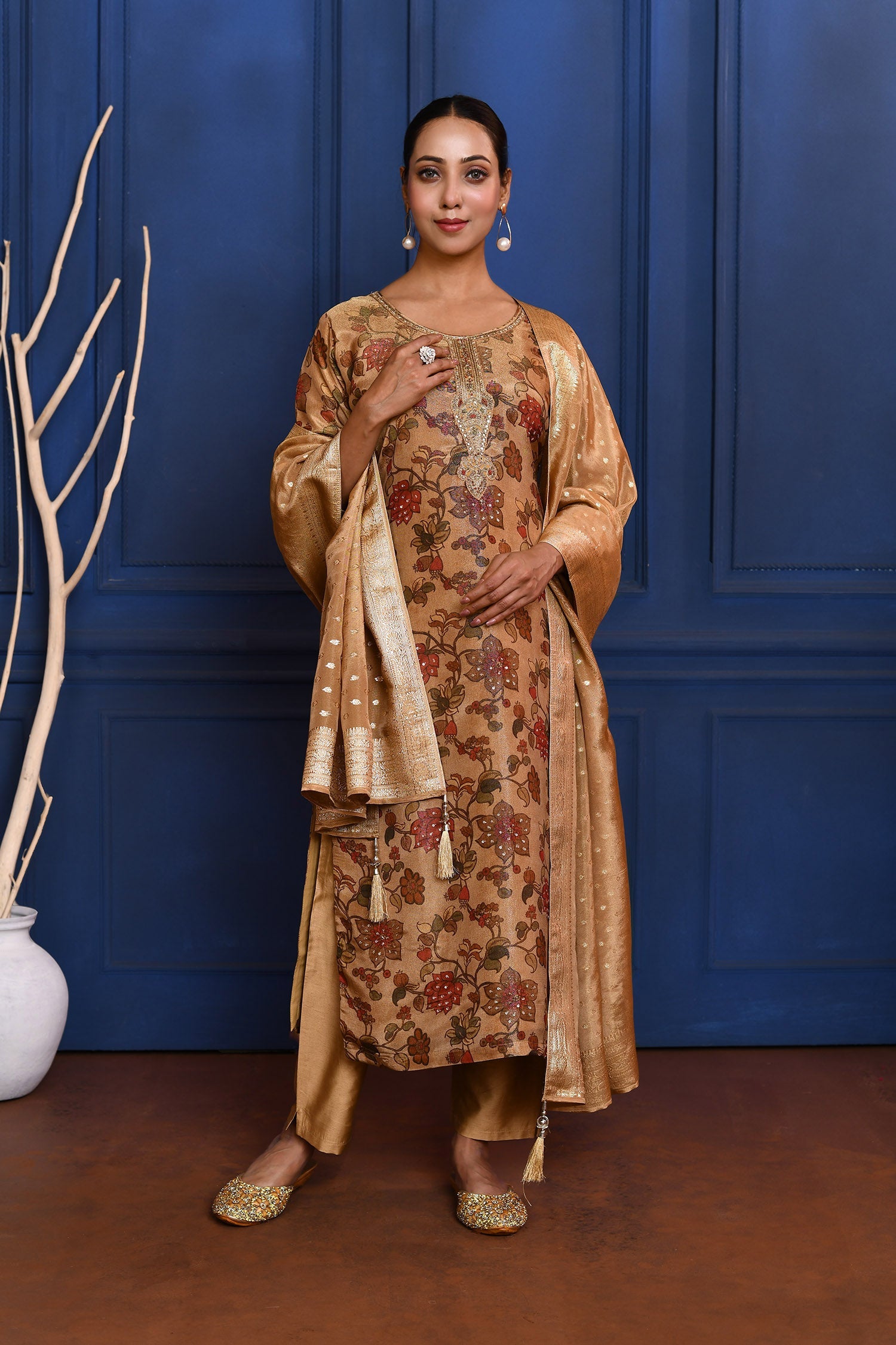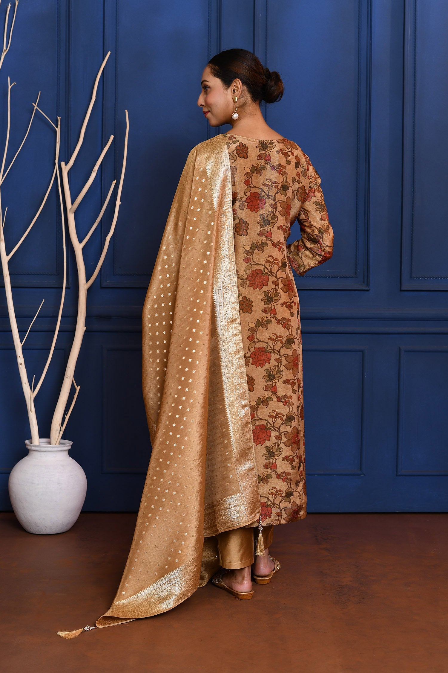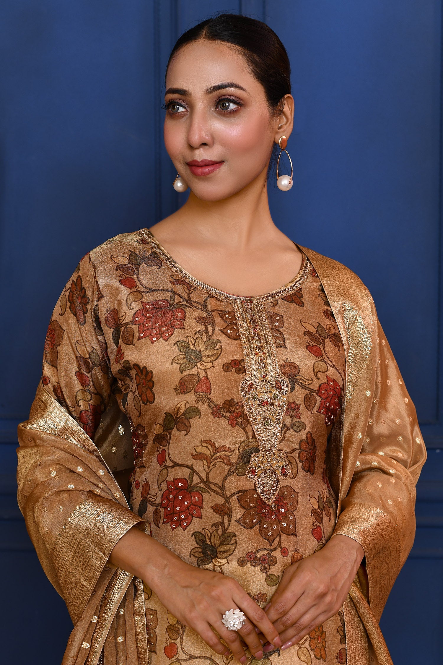 The earthy golden floral printed tissue kurti with matching zari woven dupatta and pant for a decent traditional look with graceful appearance.