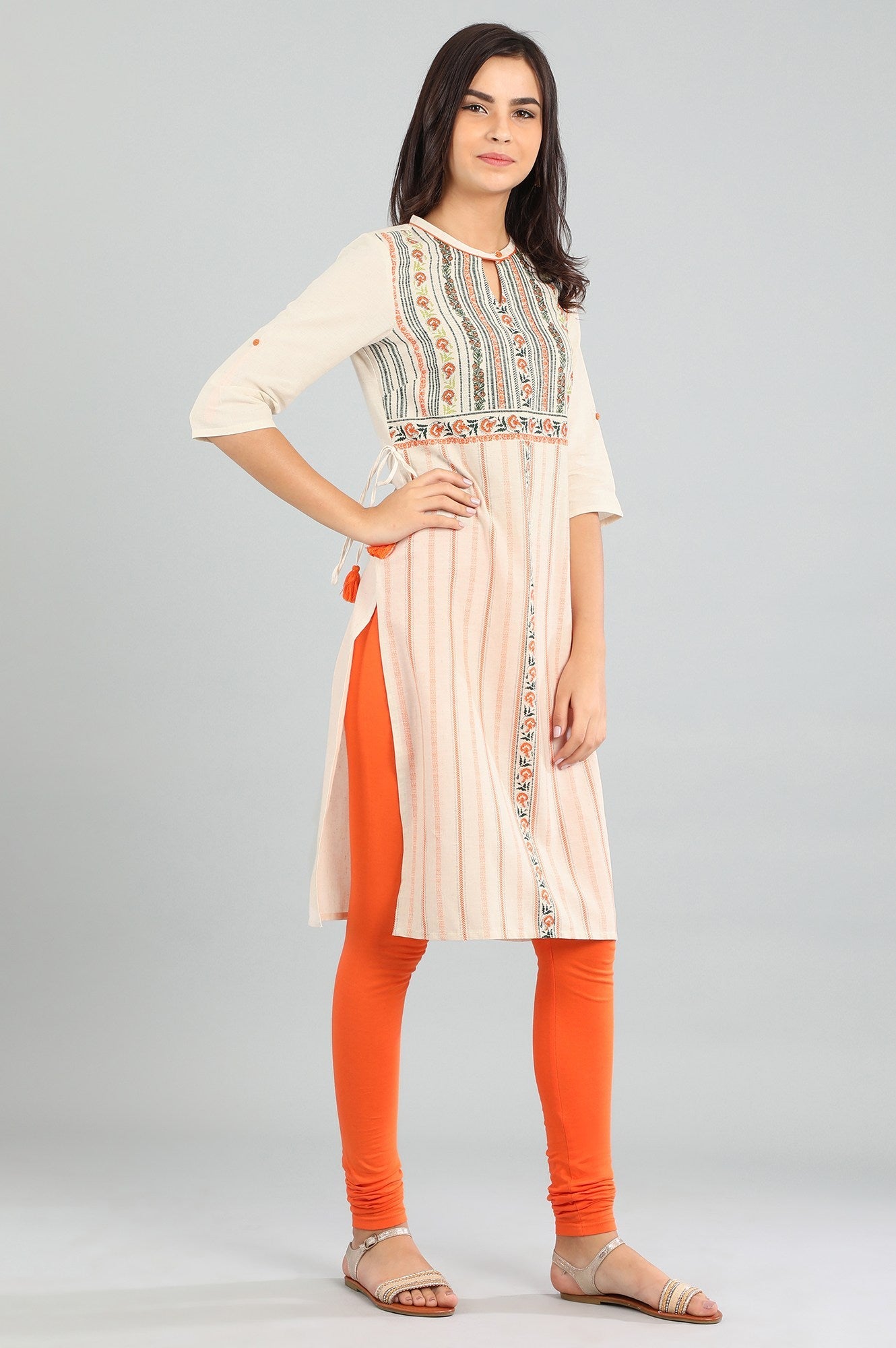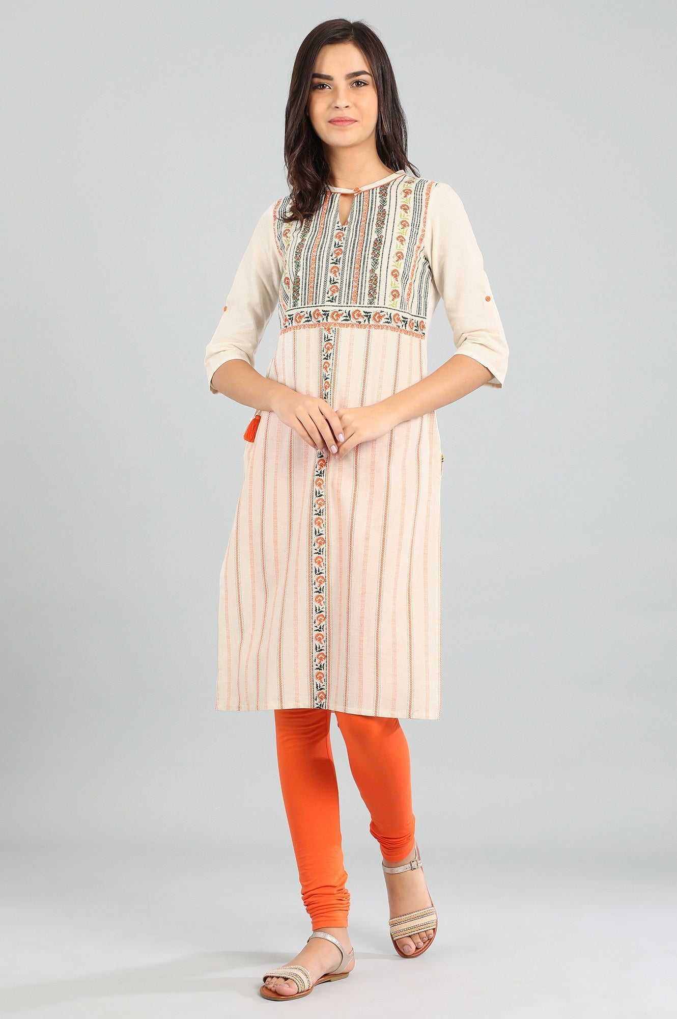 Ecru band collar 3/4 sleeve kurta with contrast printed detail, tie-up at one side and v-slit neckline. It is made up of cotton flax.