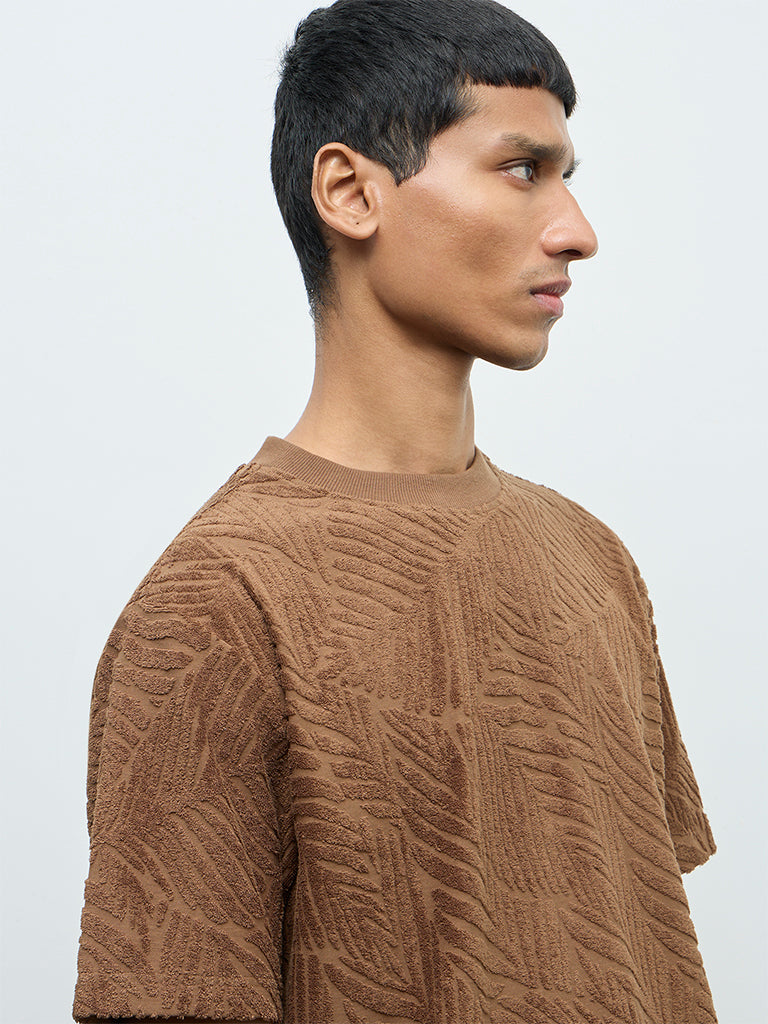 Bringing subtle detail to everyday dressing, this brown t-shirt from ETA is crafted from a soft cotton-blend fabric that feels light and breathable. The botanical textured pattern adds dimension to the relaxed silhouette. Finished with a crew neck and short sleeves, it works well for casual days and off-duty plans.