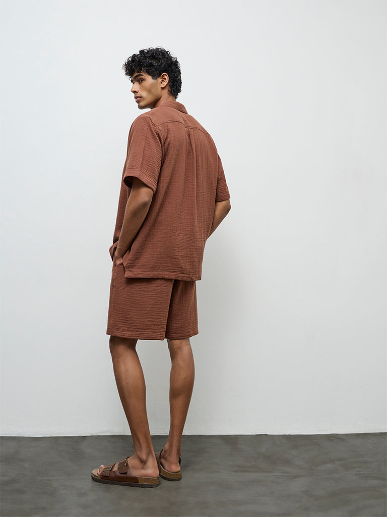 ETA Brown Crinkle-Textured Relaxed-Fit Mid-Rise Cotton Shorts