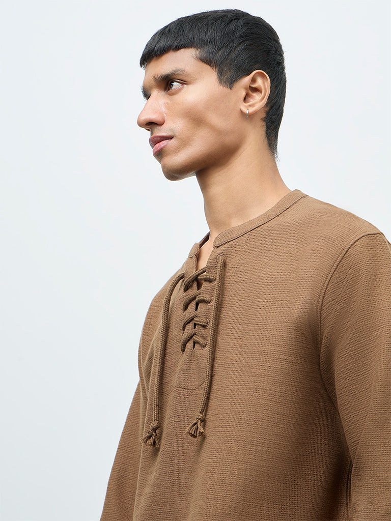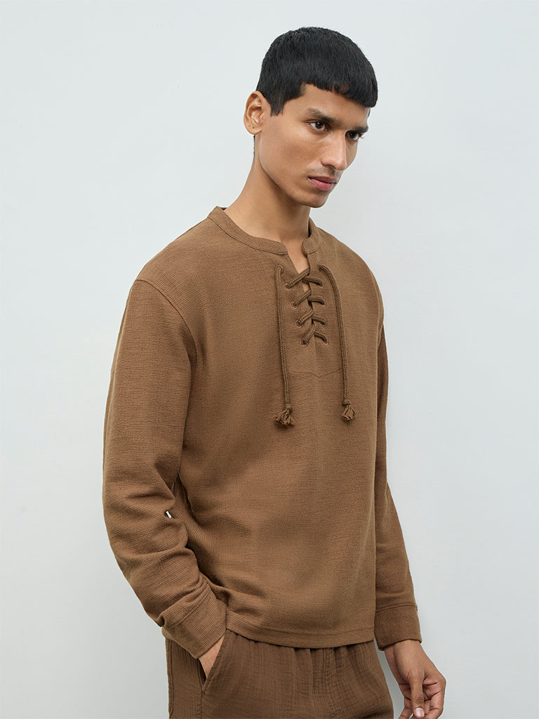 Adding a distinctive touch to everyday wear, this brown t-shirt from ETA features a criss-cross lace-up detail at the neckline. Crafted from a soft cotton-blend fabric, it offers breathable comfort with a lightly textured finish. Designed in a relaxed silhouette with full-length sleeves, it works well for casual layering and off-duty styling.