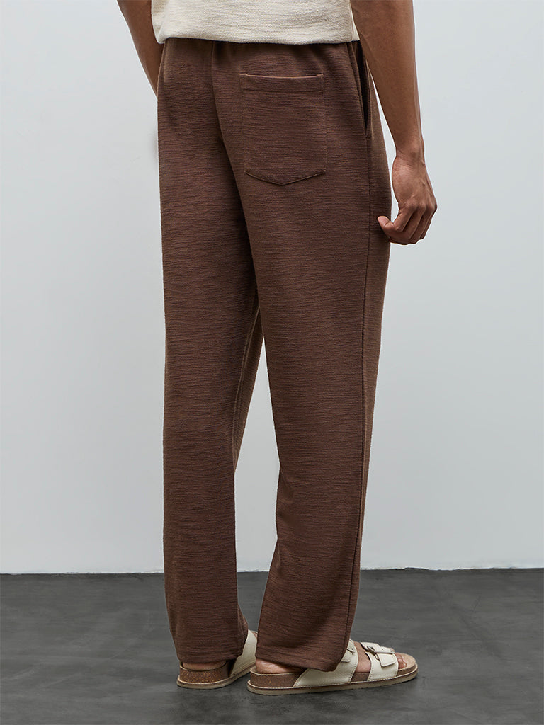 Made to support daily routines, these brown chinos from ETA are woven from a cotton-blend fabric that lends a soft-hand feel. The relaxed silhouette is complemented by a mid-rise waist and is fitted with an elasticated waistband and adjustable drawstrings for a flexible fit. Finished with multiple pockets, they bring ease and practicality to casual wardrobes.