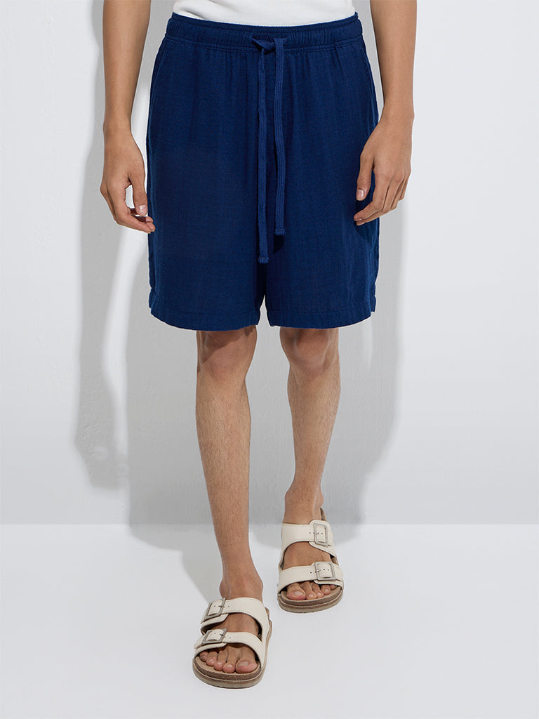 These indigo shorts from ETA are tailored in a relaxed frame for everyday ease. Crafted from a rich cotton-blend fabric, they feature a mid-rise silhouette, smooth elastic waistband with adjustable drawstrings, and multiple pockets for added functionality and style.