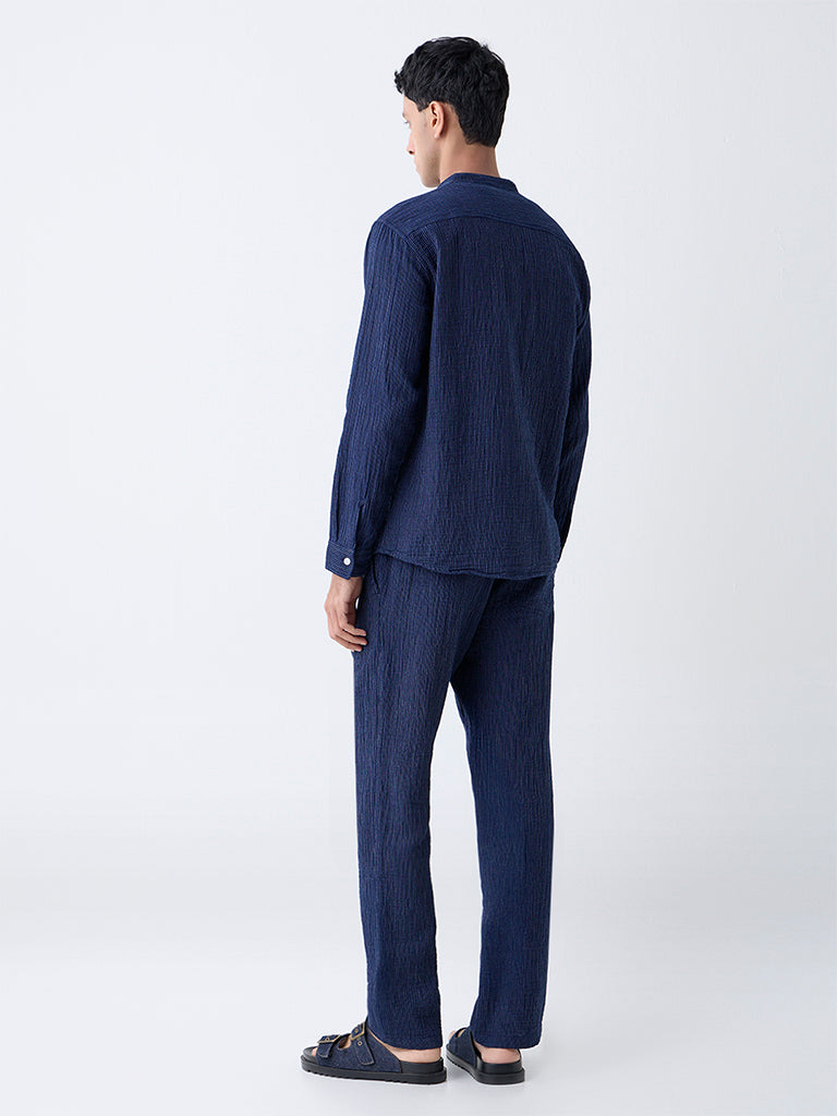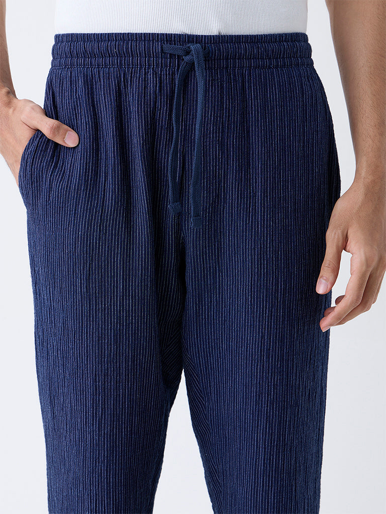 ETA launches these navy pinstriped cotton pants, designed to redefine everyday comfort with a refined touch. Crafted from soft cotton in a relaxed mid-rise fit, they feature a smooth elastic waistband with adjustable drawstrings and multiple pockets, making them a versatile essential for modern dressing.