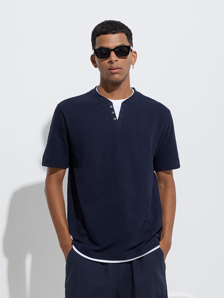 This navy t-shirt from ETA is constructed from a cotton-rich fabric in a relaxed silhouette for easy comfort. Styled with a round neck that merges into a V-cut with a three-button placket, it’s finished with half sleeves.