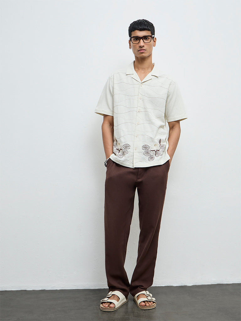 Lean into artisanal detailing with this off-white shirt from ETA, highlighted by intricate floral embroidery and wave-inspired embroidered accents at the front. Made from a cotton-rich fabric in a relaxed profile, it features a camp collar flowing into a button placket and short sleeves.