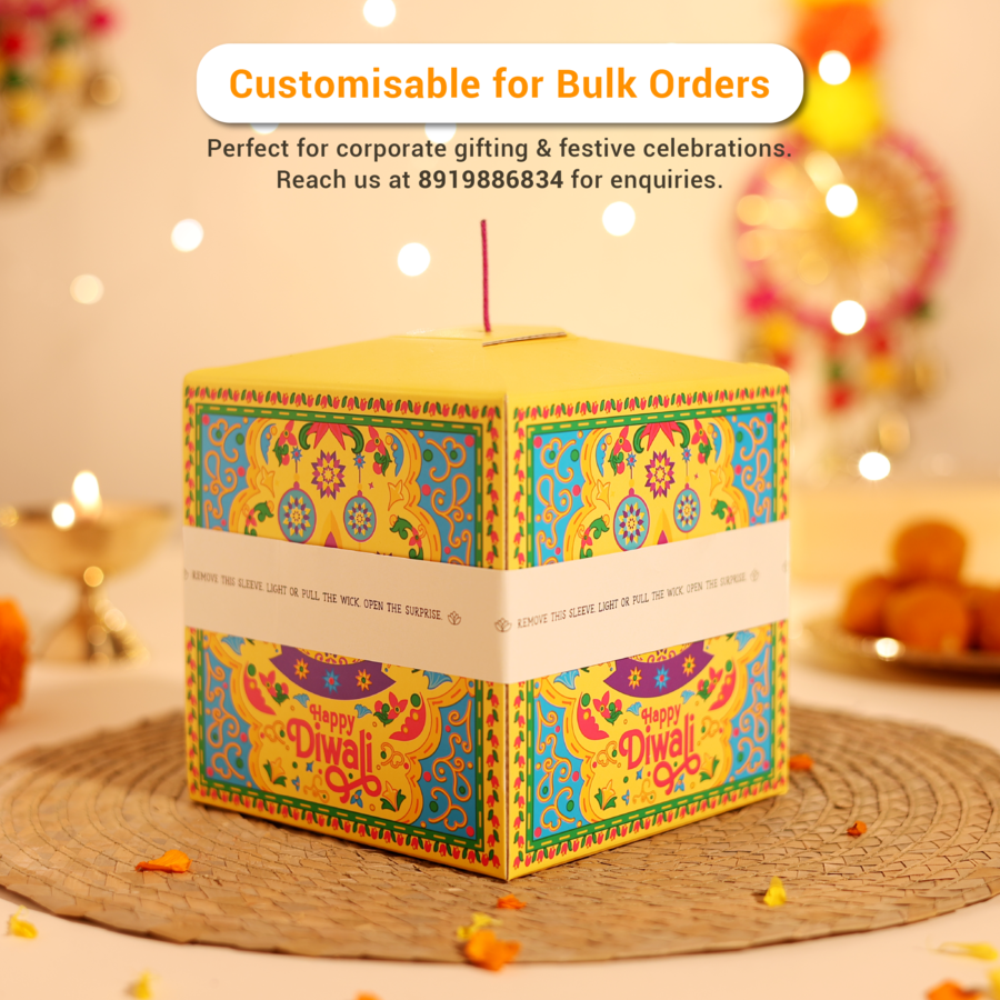 Introducing India’s First Patakha Box — a one-of-a-kind festive surprise that looks like a cracker but opens up as a magical hamper. It’s designed to give you the joy of lighting something special without any noise, or pollution.