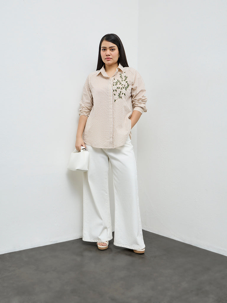 This beige stripe-printed shirt from Gia highlights floral embroidery for added charm. It is milled from cotton-rich fabric, offering a soft feel and a superior comfort. Designed with a notched collar, a button-up front and full sleeves, this relaxed silhouette serves as an effortless pick for your day-to-day rotation.