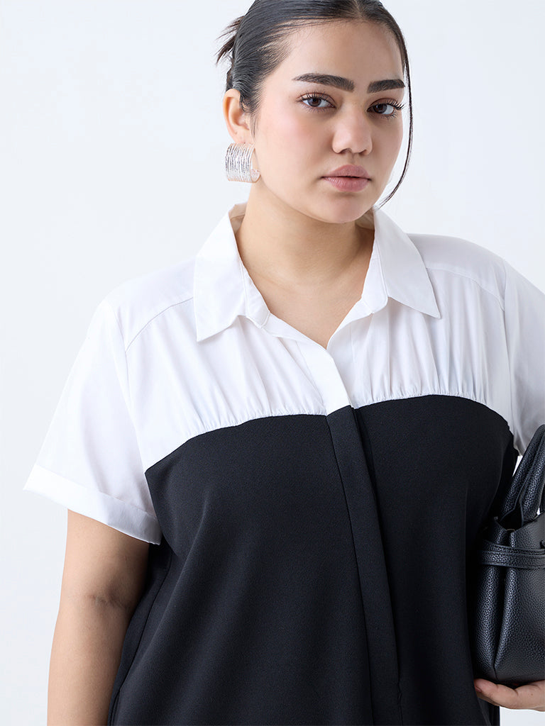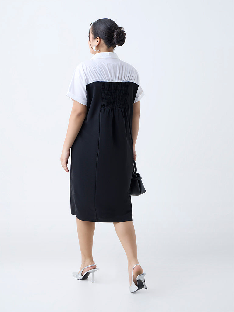 Made for nights that call for effortless glamour, this black A-line dress from Gia is reimagined in a striking colour-blocked profile. A smart collar leads into a concealed button placket, while short sleeves and practical side pockets add functionality. Spun from a breathable fabric, it blends comfort with after-dark polish.