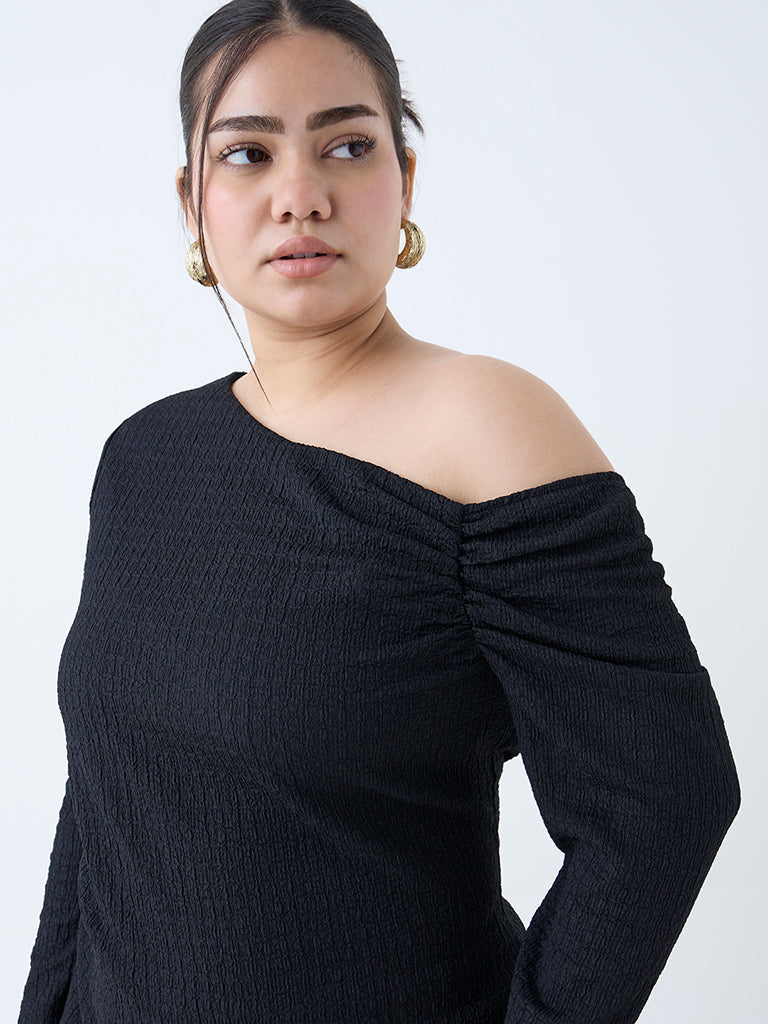 Sleek and statement-worthy, this black one-shoulder top from Gia is made from a crinkle-textured fabric that adds depth and dimension. The asymmetrical neckline offers a bold silhouette, while ruched detailing along the full sleeve introduces just the right amount of drama.