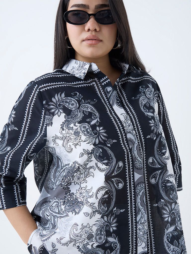 Effortless charm meets timeless detail in this black shirt from Gia, adorned with delicate paisley motifs. Spun from pure cotton for elevated comfort, it features a classic collar that flows into a button placket, while three-quarter sleeves lend a polished finish.