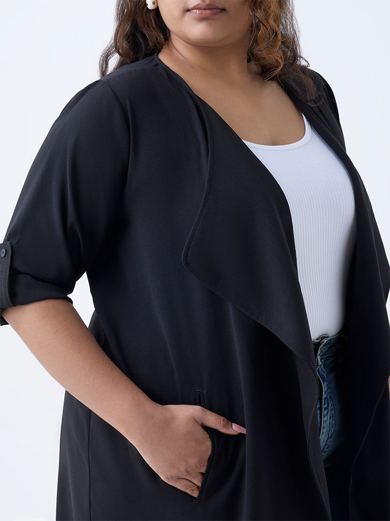 Slide into effortless chic with this black solid shrug from Gia. Featuring an open front and full sleeves, it exudes understated sophistication, while side pockets add functional ease. The elasticated band at the back ensures a flattering fit, making it a versatile layering piece for weekend ensembles.