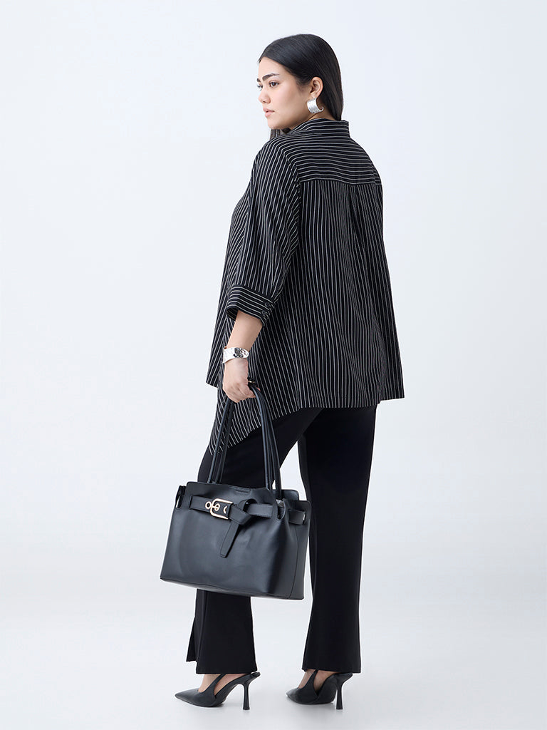 Timeless style meets everyday ease in this black striped blouse from Gia. Tailored from a sumptuous linen-blend fabric, it’s detailed with a classic collar, three-quarter sleeves, and a concealed placket for a polished finish.