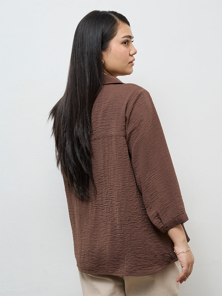 Designed with ease in mind, this dark brown blouse from Gia delivers a clean silhouette that feels effortlessly put together. Crafted from a soft fabric, it offers a fluid drape that flatters curves without clinging. Pintuck detailing around the yoke adds subtle texture, while the notched neckline and three-quarter sleeves keeps the look open and balanced.